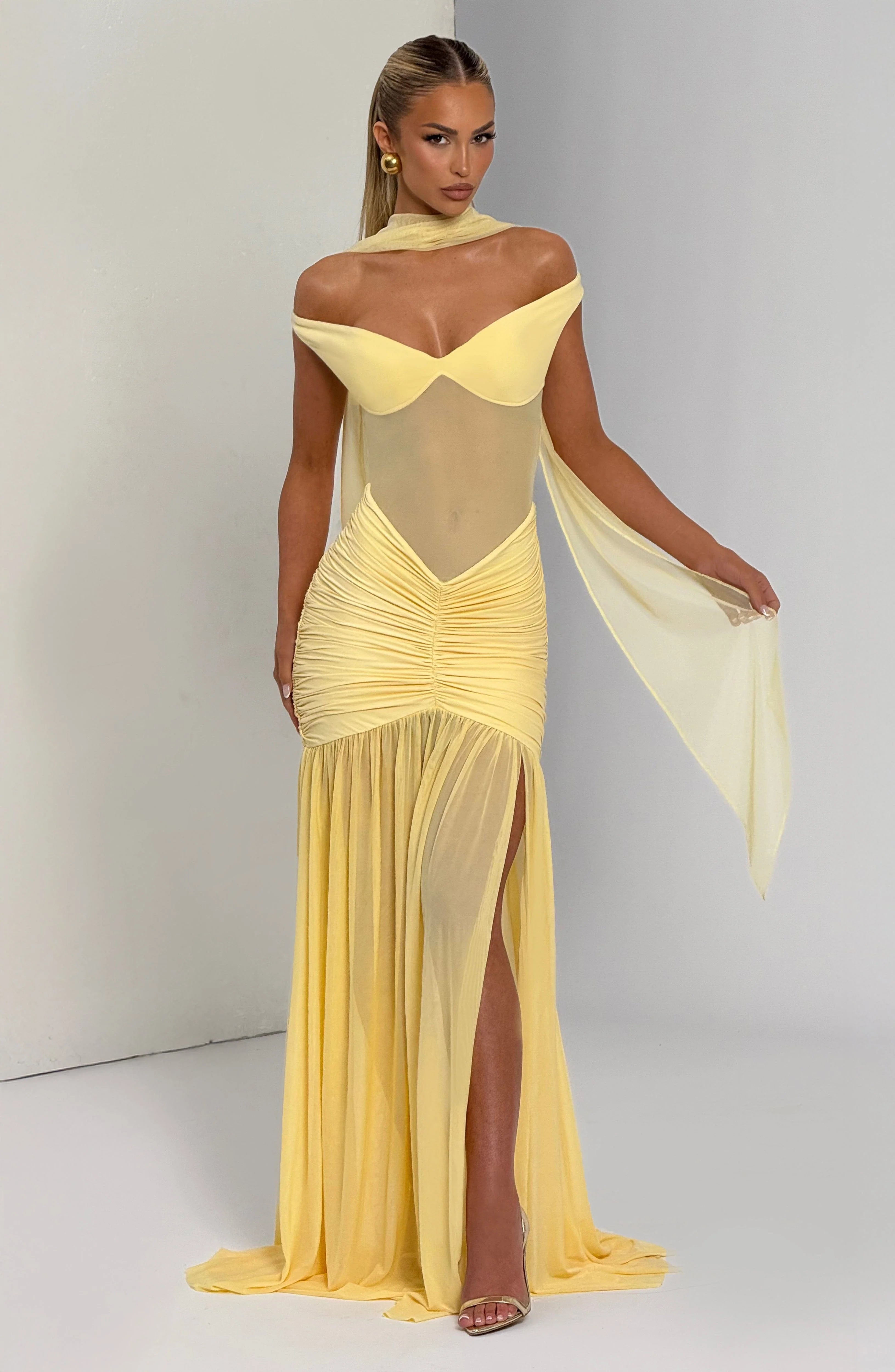 The Alaia Maxi Dress in lemon features a sheer mesh bodice and a bardot neckline, complemented by an elasticated back strap for a perfect fit. Its tightly ruched hips and dropped waist lead to a flowing full sheer skirt with a thigh-high split, crafted from mesh fabric for elegant movement.