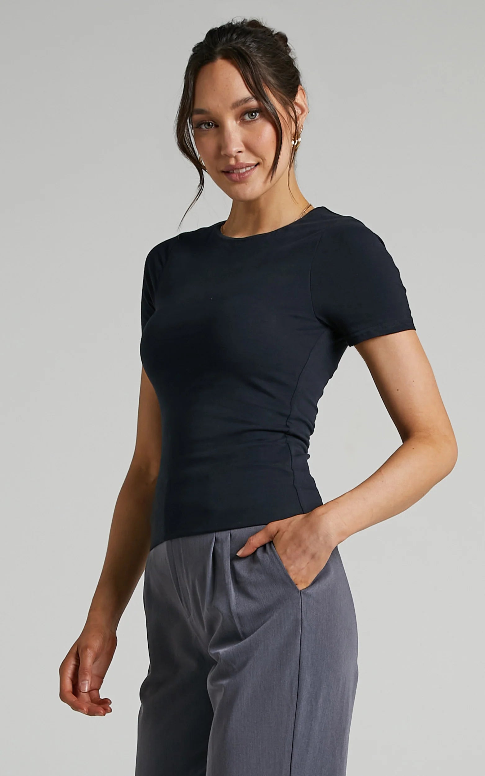 Create a simple but cute work look by tucking this one into the Lorcan High Waisted Tailored Pants in Charcoal and adding heels to match!