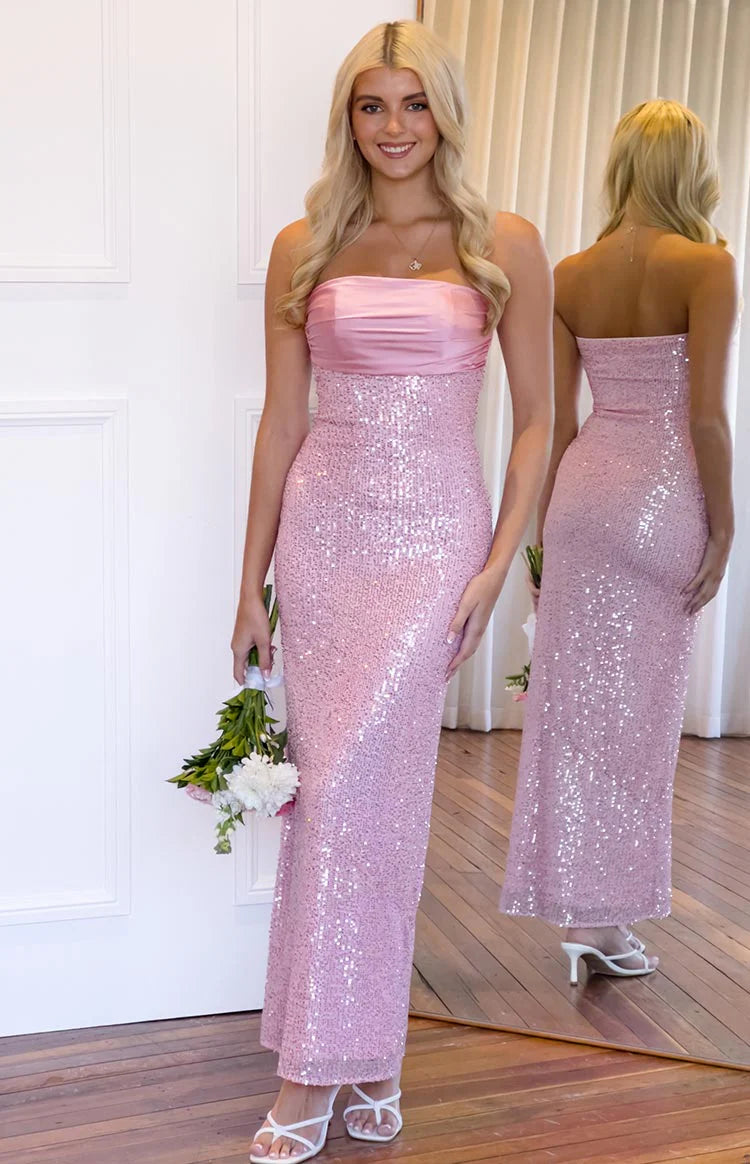 Crafted to impress, our Alliana Pink Maxi Dress brings timeless beauty to your collection, perfect for prom or a black-tie celebration! This glam gown features a romantic gathered satin bust and a dazzling floor-length stretch-sequin skirt for a truly iconic look! Complete your polished look with sparkling jewellery and simple heels to capture everyone's admiration.