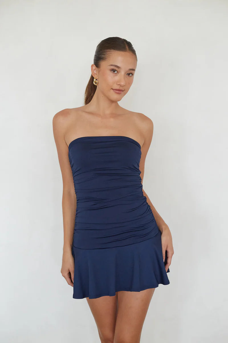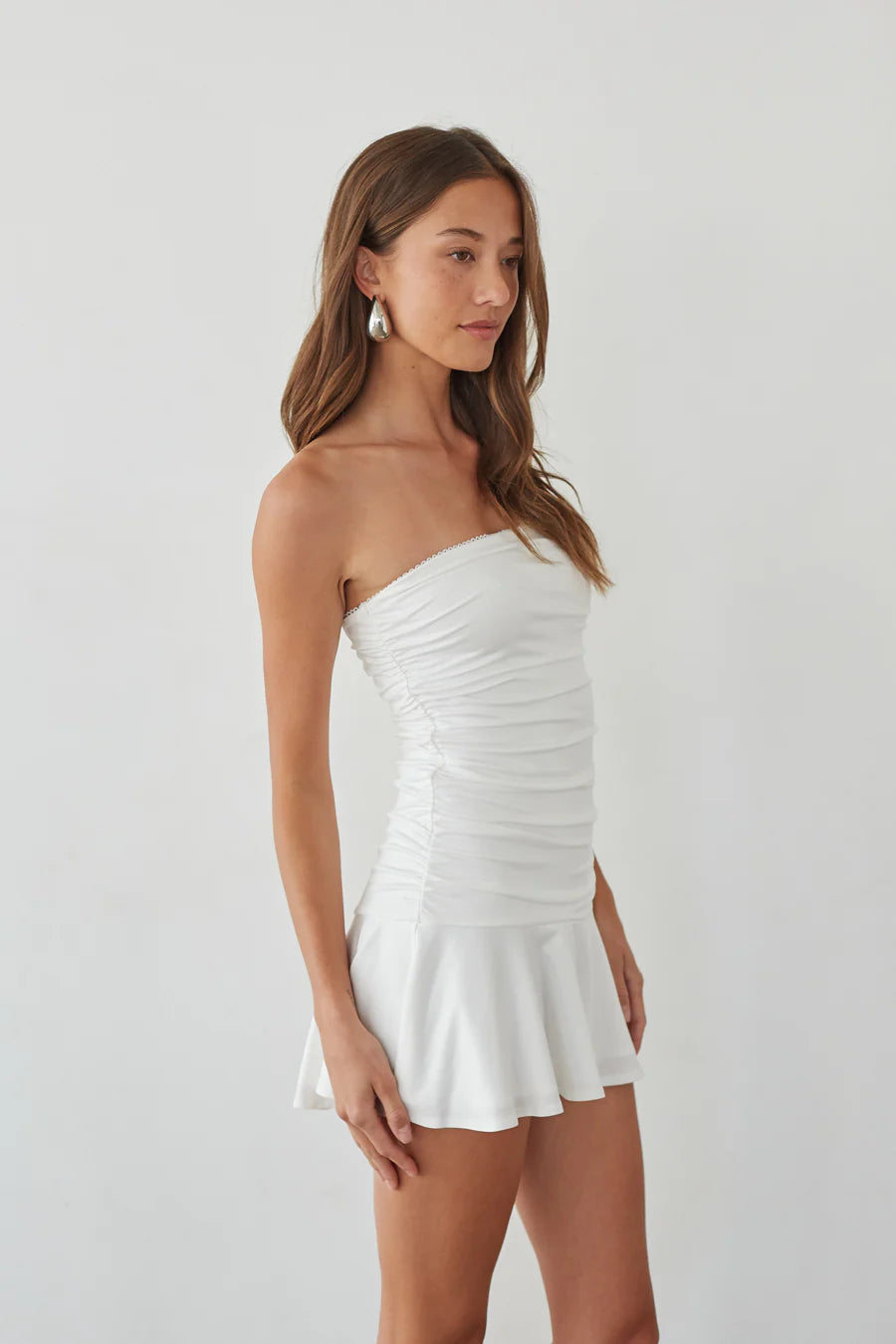 Slip into something sexy with the Alora Strapless Ruched Mini Dress. This must-have mini dress features a simple strapless neckline, flattering bodycon silhouette, and flirty flare ruffle hem. Available in White, Black, and Red; style with a pair of chic heels to complete the look!