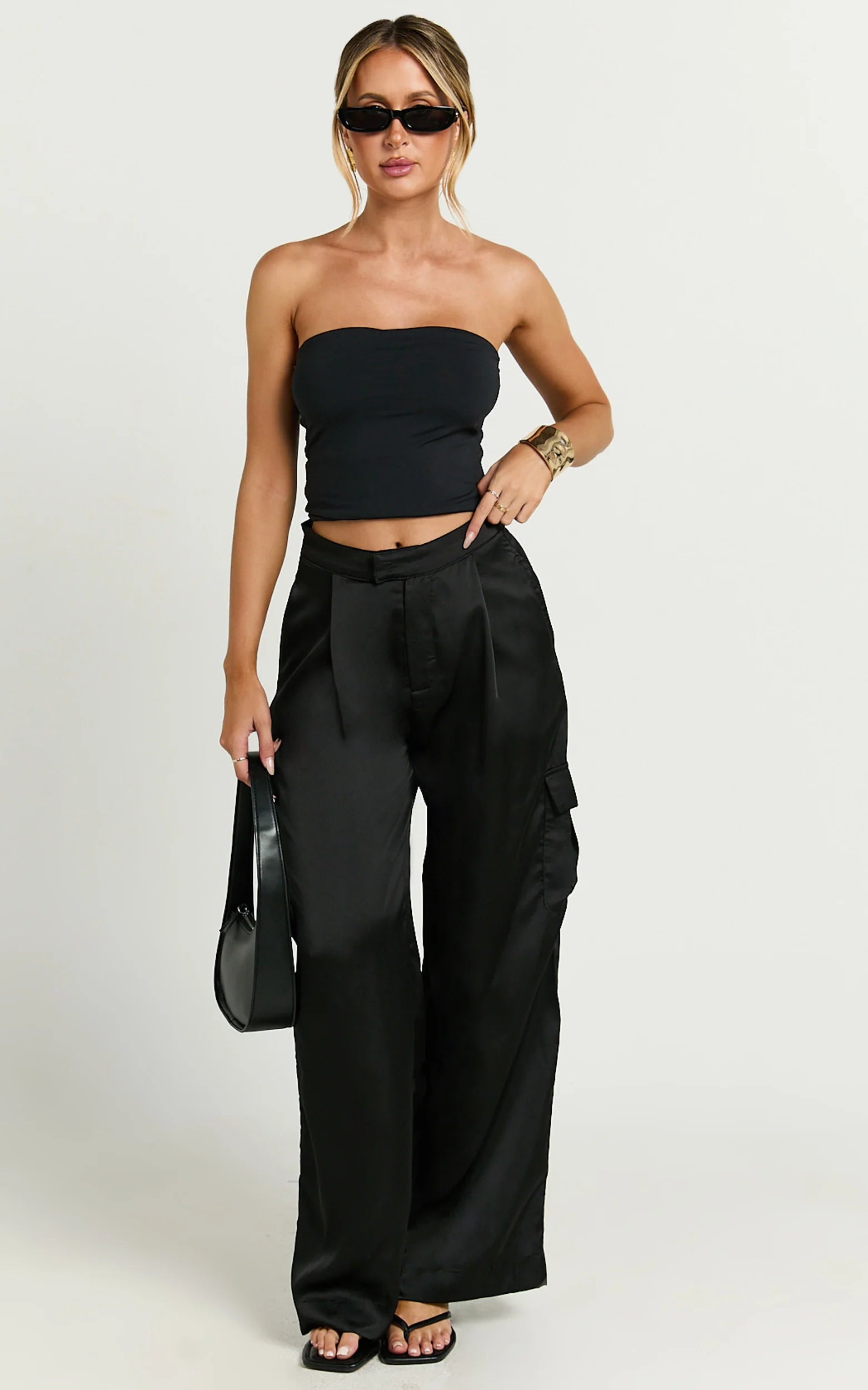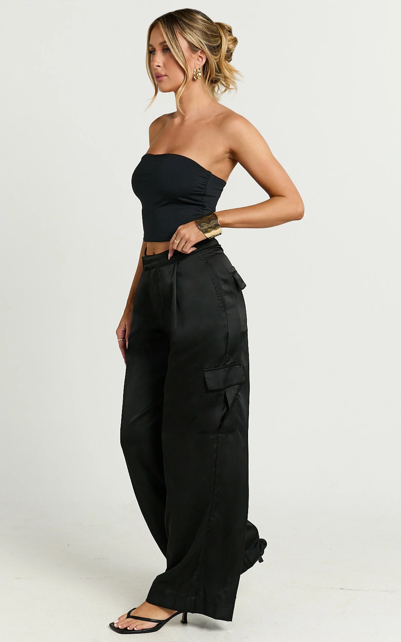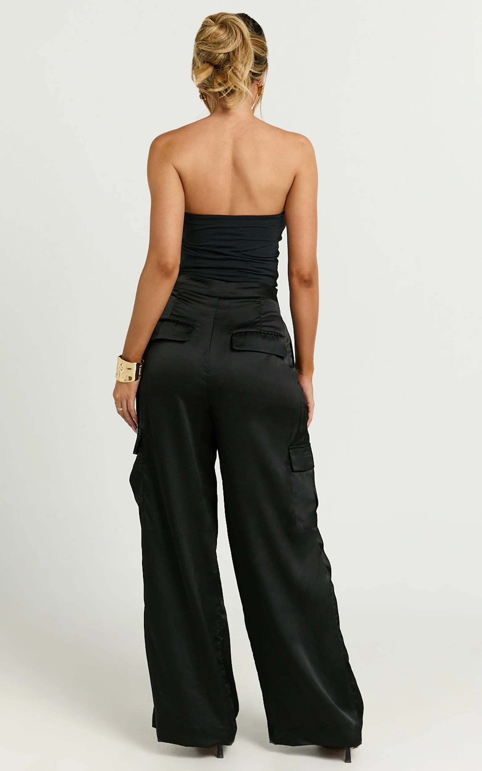 Make a bold statement and amp up your wardrobe with our Amie Pants - your new go-to for an effortlessly chic vibe. Crafted with sleek black satin and precision tailoring, these high waist cargo pants embody elegance with an edge. Whether it's a casual hangout or the pulse of a party day, these full-length trousers are a perfect choice for any event on your calendar.