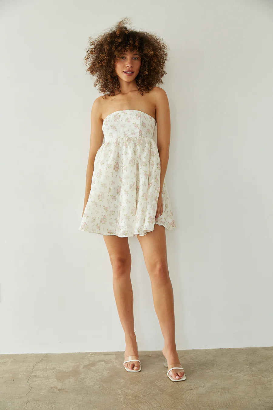 Be the life of the party in the Bella Strapless Babydoll Dress! This gorgeous mini dress is fully lined with an organza overlay. Available in blush pink, blue, blue floral, black, and white. Pair with some cowboy boots for a trendy take on a classic style!