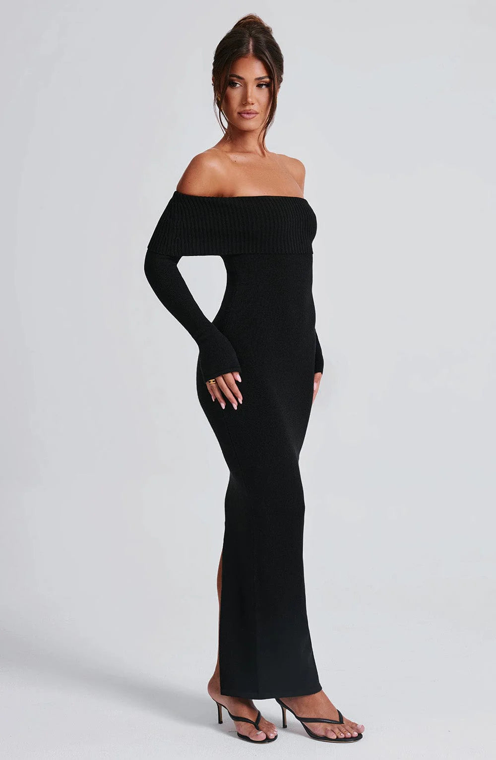 Lightweight knits are THAT girl. We adore our soft, pretty Beverley maxi, made in premium knit that hugs your body like a glove. Featuring off the shoulder styling with a wide bardot fold over panel, long fitted sleeves which flare at the cuff and a small split to the back skirt, pair yours with effortless, loose waves and gold jewellery.