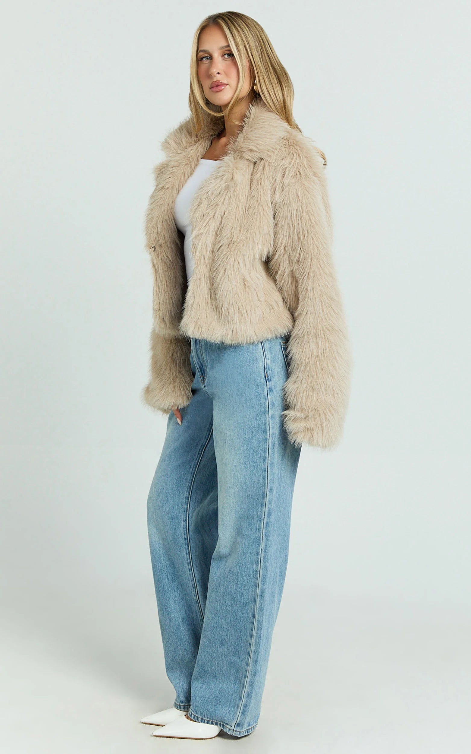 Designed as a standout statement piece, this oversized cropped coat features plush faux fur in a dreamy, soft brown shade. Perfectly blending Y2K nostalgia with modern flair, it instantly elevates any look.