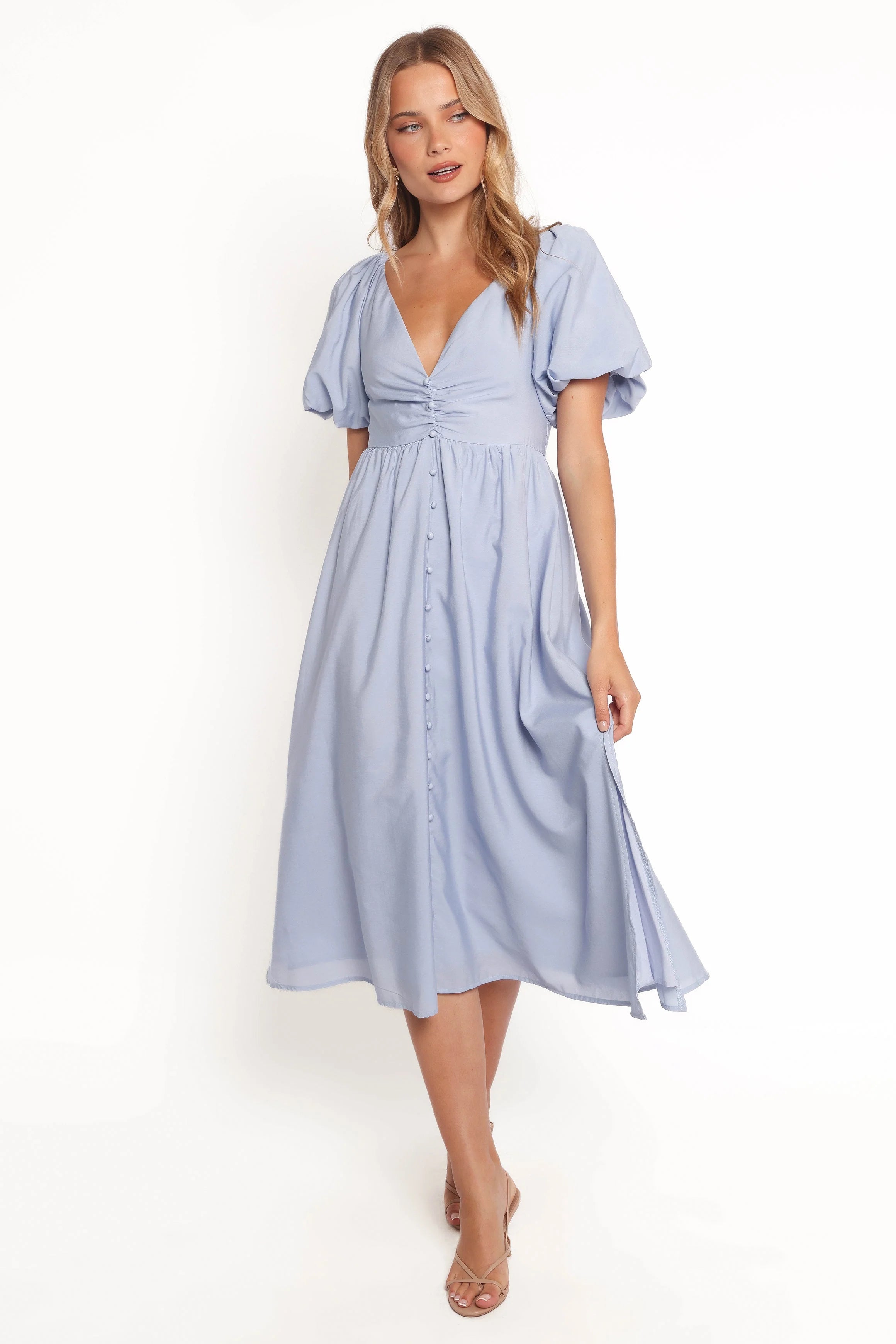 DETAILS Effortlessly chic, the Charley Midi Dress in Blue features a classic midi length and an elegant V neckline, this dress brings a timeless appeal to any occasion. The short puff sleeves with elasticised cuffs and shoulders add a touch of volume for a statement silhouette, while the invisible back zip ensures a seamless fit.