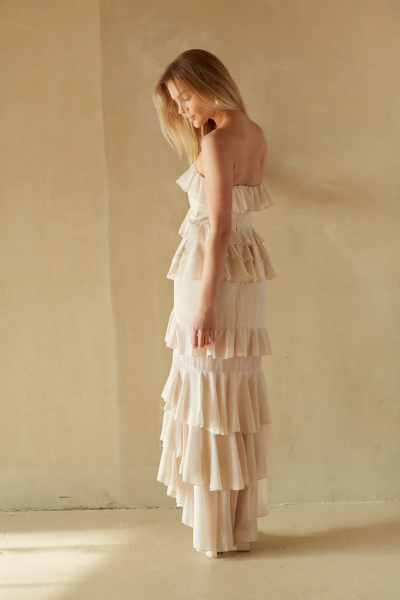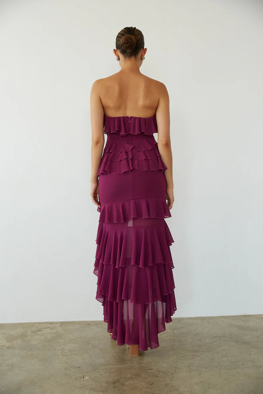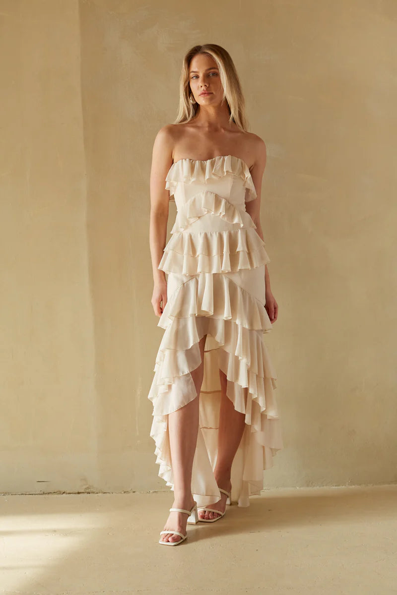 They'll be falling in love when they see you in the Clementine Strapless High Low Ruffle Maxi Dress! This elegant dress features a strapless sweetheart neckline, boning in the bust for structure, a ruffle trim, tiered ruffles throughout, and a high-low hem. Finish off the look with some simple accessories!