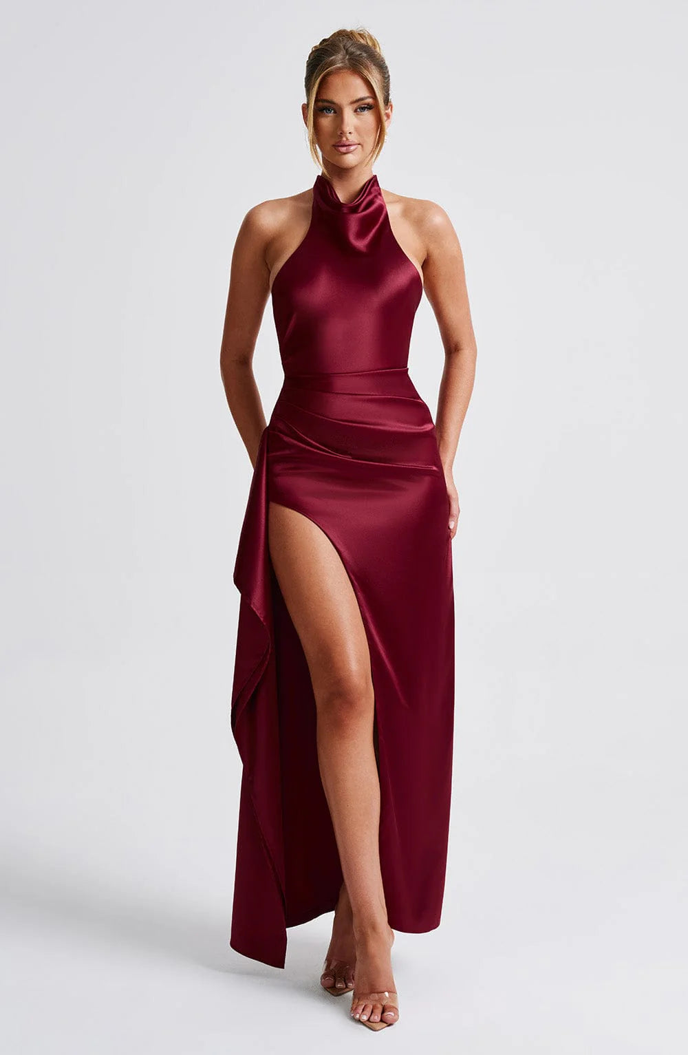 Exuding feminine glamour, Colette has a sleek silhouette, cut from our luxe satin with a beautiful shine. It's fully lined with an elegant pleated cowl neckline, low scoop back and tie to the back of the neck. The maxi design is complete with asymmetric pleats to the body and a draped thigh high split. Best worn with black high heels to your next dinner date.