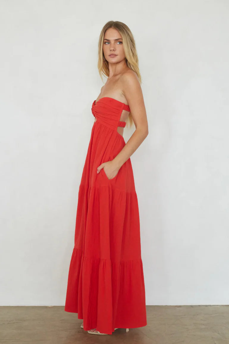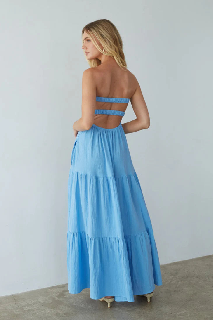 Our best selling Savannah Romper now in a maxi dress! This adorable Maxi dress features a full skirt, a pleated bust with a keyhole twist front design, an open back with two elastic straps, and tiered skirt.