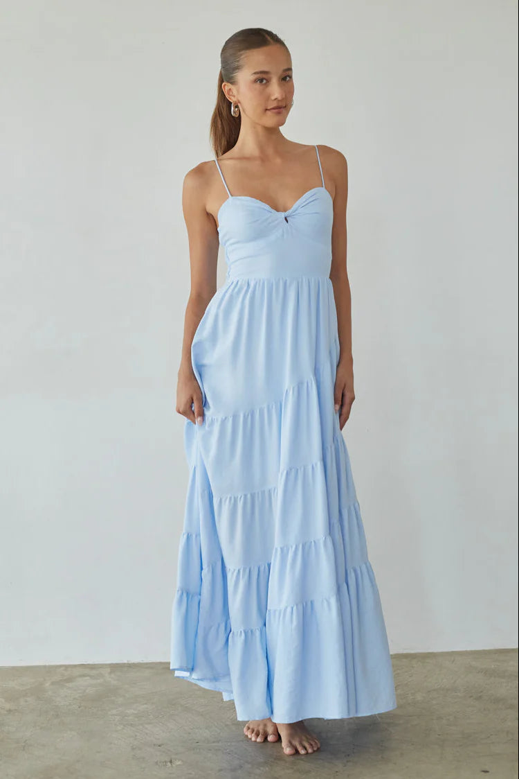 Calling all angels, the Donna Twist Front Tiered Maxi Dress is romance embodied. This white maxi dress features a flattering fit and flare silhouette, sexy twist front detail, and tiered flowy maxi skirt. Accessorize to complete the look!