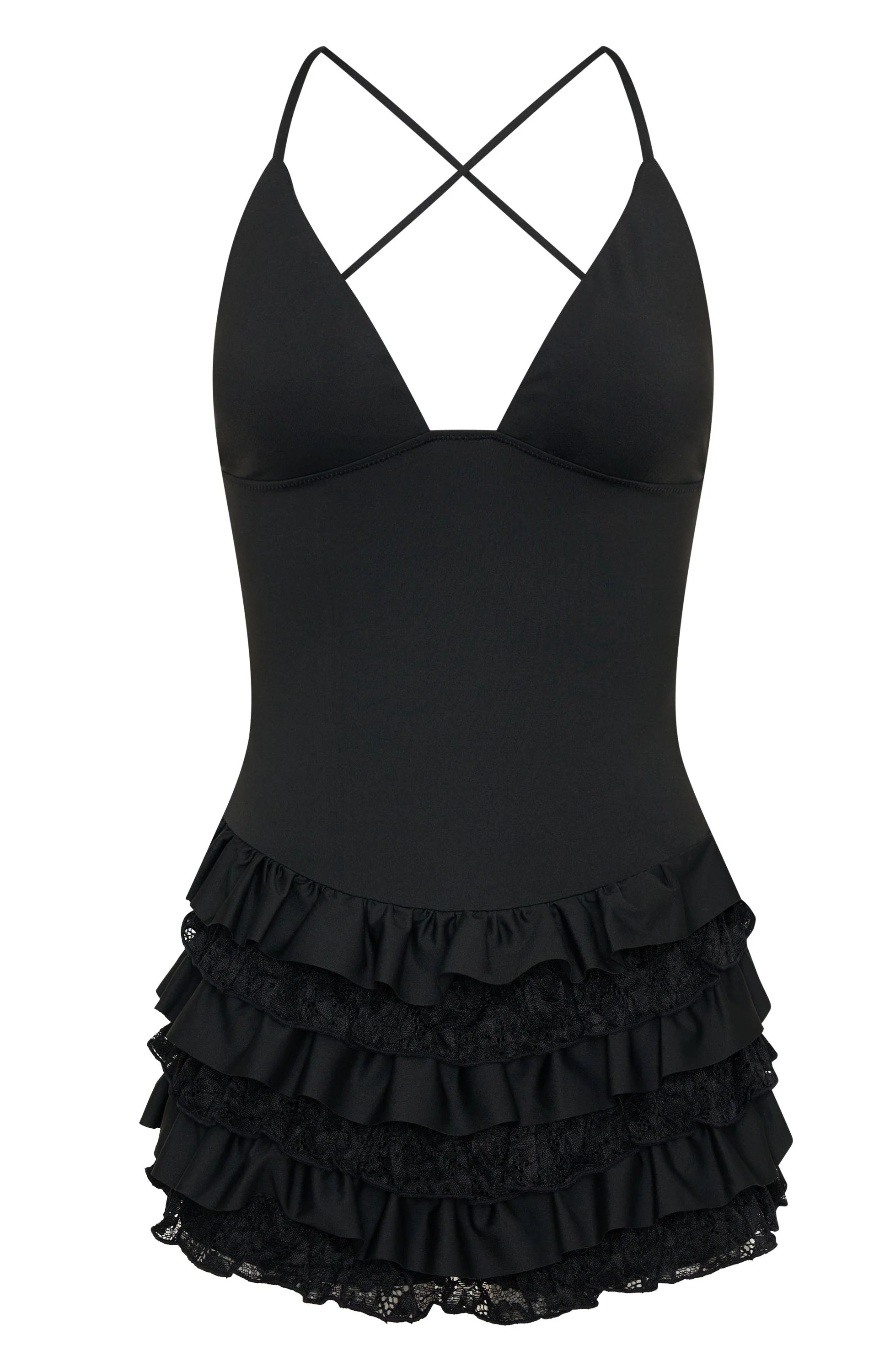 Mosh pit approved! The Dream Of Me Playsuit Black features thin, adjustable shoulder straps, back lace up closure, sweetheart neckline, lined, built in booty shorts, fitted at bodice, ruffle detailing at skirt and stretch material for an easy slip on design.