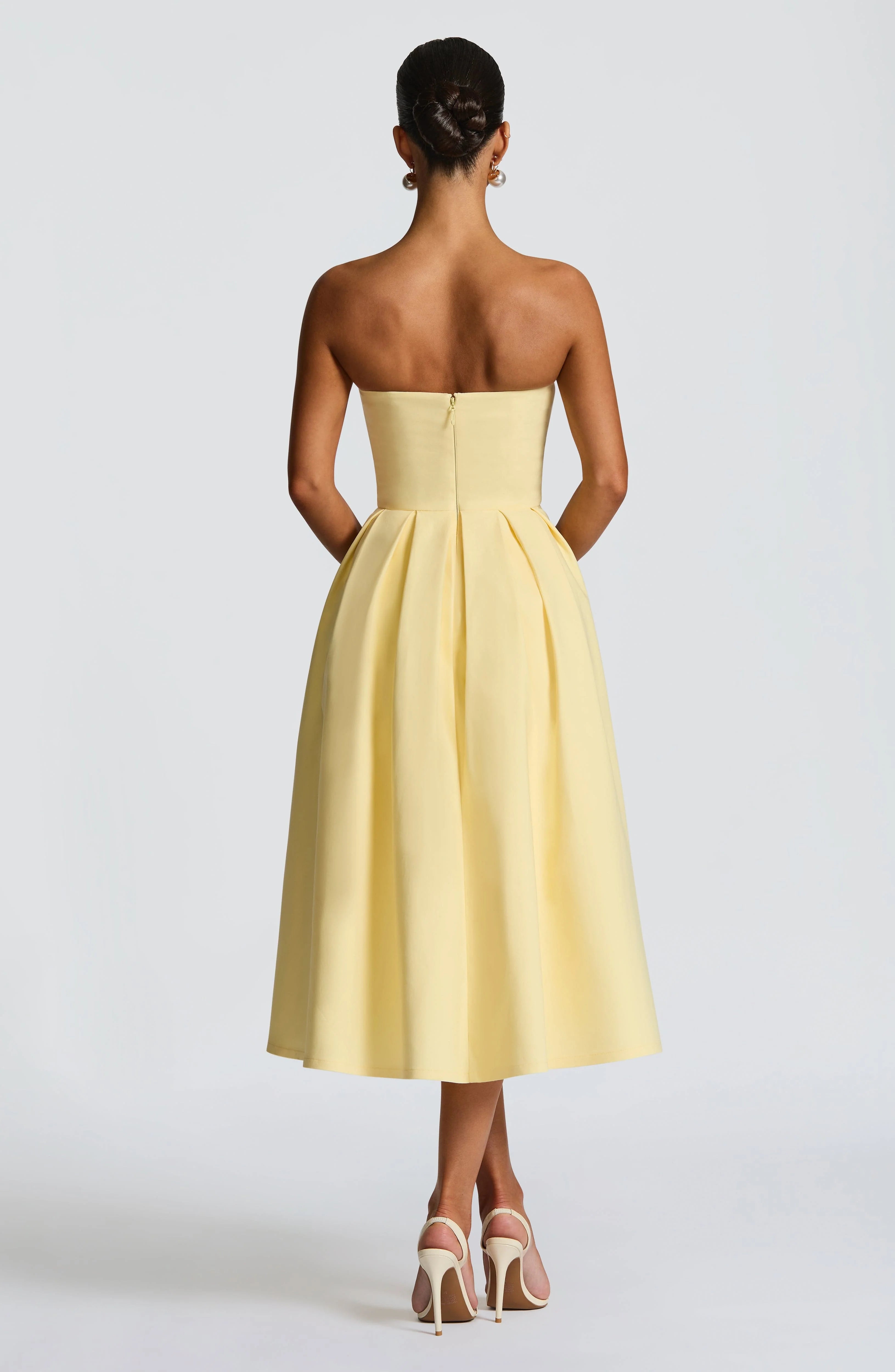 Exquisite strapless Edith Midi Dress in vibrant lemon. Features premium stretch bengaline fabric, structured bodice with elegant boning, and a graceful full skirt with refined inverted box pleats at the waist.