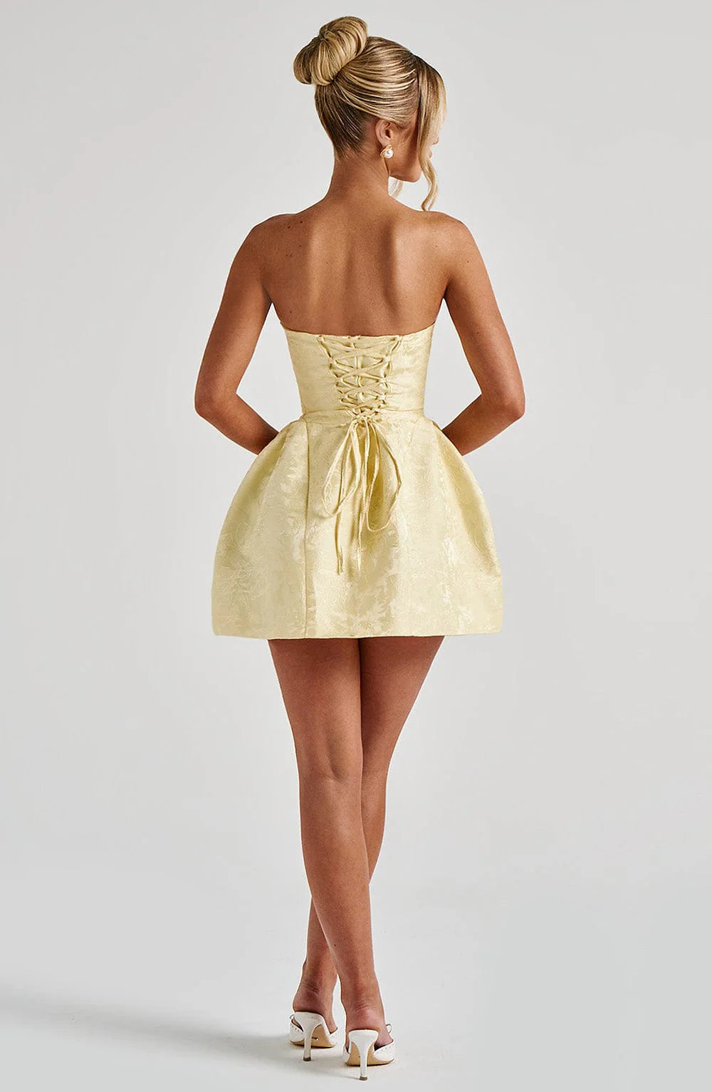 The Elenora Mini Dress in Lemon is the perfect choice for your next special occasion. Crafted from a luxurious floral jacquard fabric, this dress exudes elegance with a playful twist. The strapless neckline and panelled tulip-shaped skirt create a flattering silhouette, while the lace-up back ensures a customisable fit. A detachable oversized bow on the back completes the look. Ideal for summer weddings, garden parties, or an evening out. Pair the dress with delicate heels and a simple clutch for a refined look.
