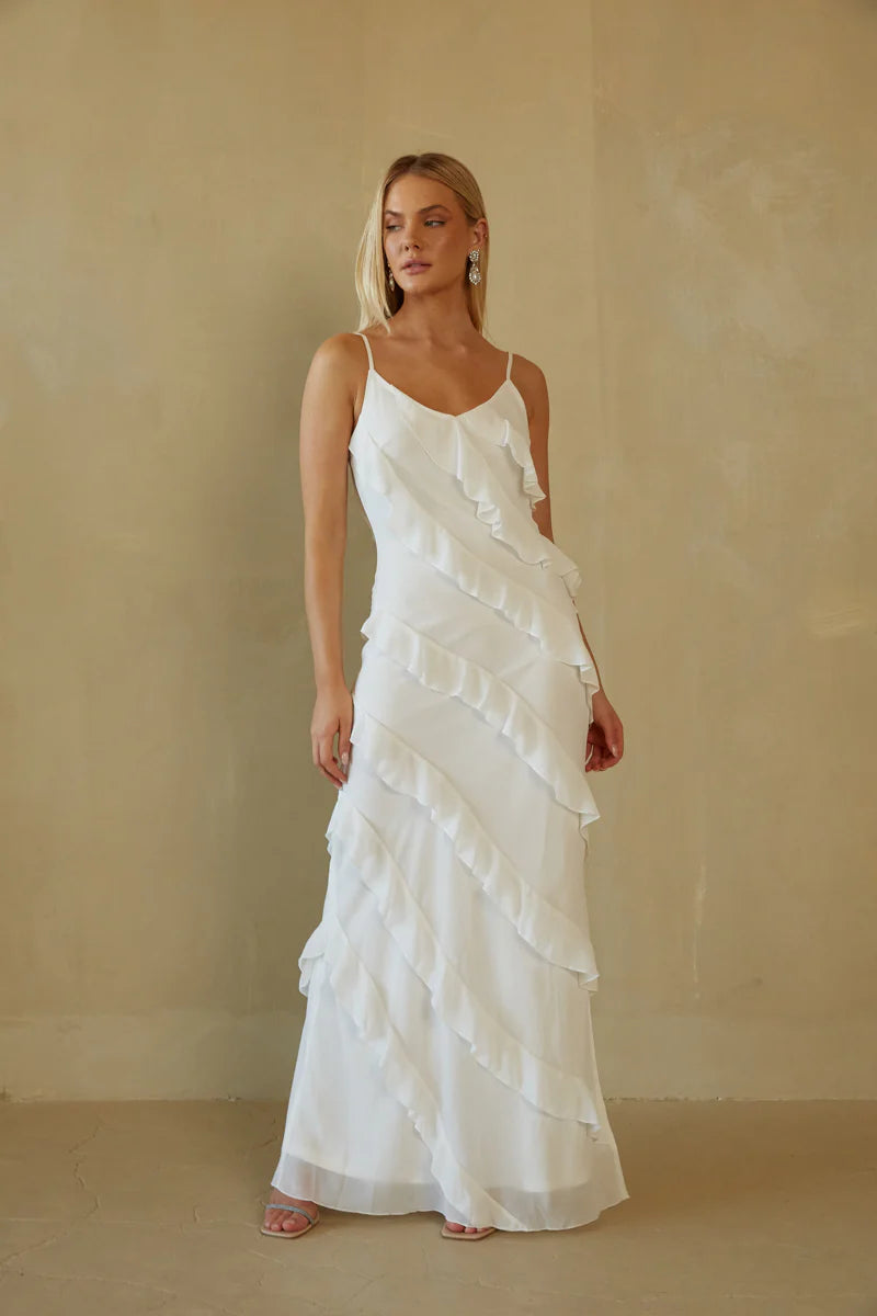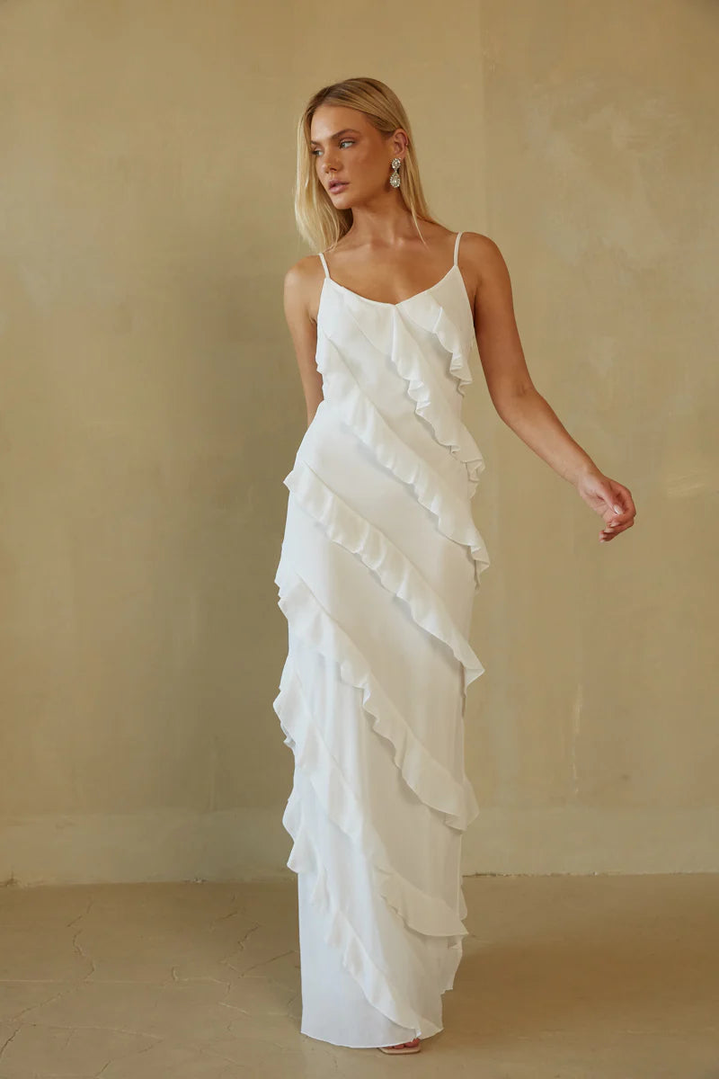 Embrace your femininity in the Elizabeth Tiered Ruffle Maxi Dress! This stunning dress features a V-neckline, asymmetrical tiered ruffles, adjustable spaghetti straps, and a side leg slit. Available in white, blue, and dusty rose. Pair with a simple heel to complete the look!