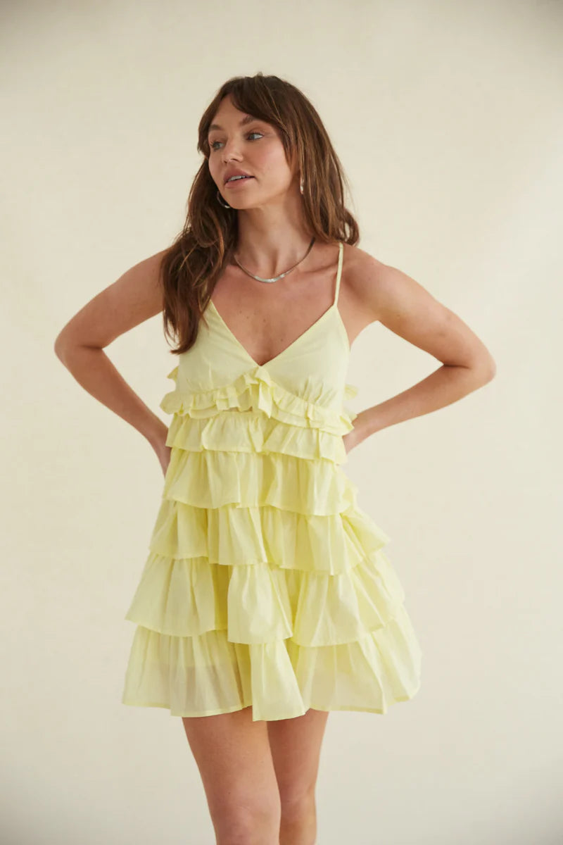 Brighten up every room you walk into in the Ella Tiered Ruffle Babydoll Mini Dress! This adorable layered ruffle dress features a v neckline and adjustable criss-cross spaghetti straps that tie in the back. Finish off the look with a cute !