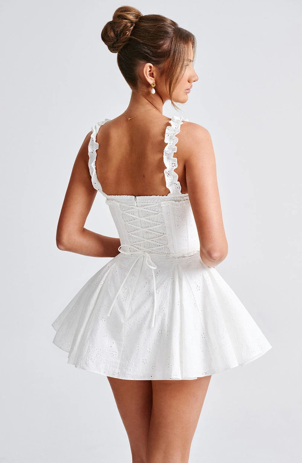 Dreaming of dainty, delicate details? Meet Elva, your new fave playsuit made in custom designed floral broderie anglaise. Featuring built in shorts, a boned corset for a snatched waist and a full skirt made with tulle and godet inserts for extra volume. This milkmaid-inspired design will be your go-to throughout the season, whether it's styled with knee high boots for bottomless brunch or heeled mules for your next date night.