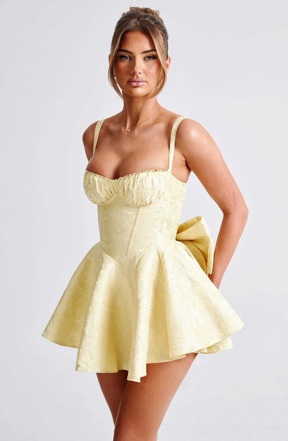 Give us all the pretty playsuits this season! Emelie is made from a premium jacquard fabric with an all-over floral design, cinching at the waist and flaring gently at the skirt which has in-built shorts. With an underwired, balconette bust and lace trim detail, the look is complete with a dramatic oversized bow at the back which you can remove.
