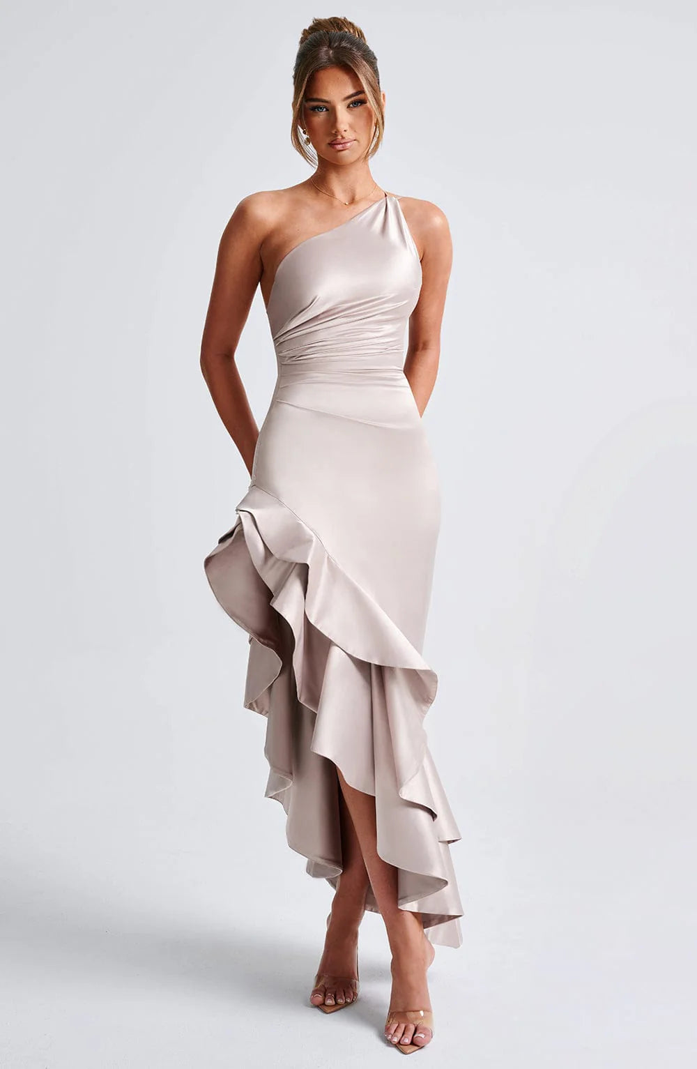 Make new memories in Esmeraya, from the moment you say YES, to the moment you say I DO. The most elegant, stunning gown to dress you through all your special events, this champagne-toned design is made from our luxe stretch satin, with dreamy double frills and gathered details. It's complete with one shoulder styling and adjustable straps for your perfect fit.