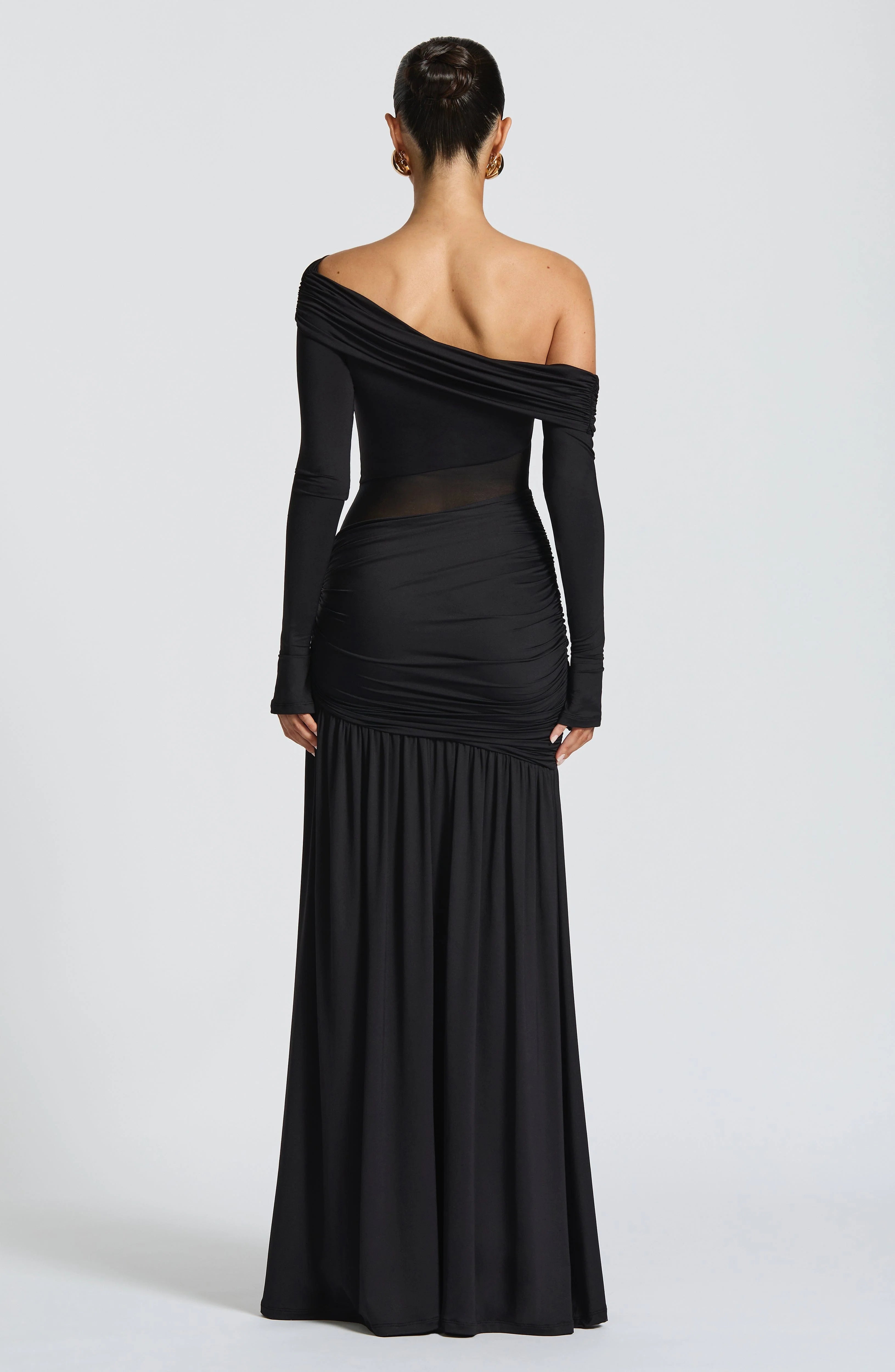 Indulge in the timeless elegance of the Ettalie Maxi Dress. Crafted from a luxurious stretch slinky fabric, this dress features a sheer mesh panel on the bodice, an asymmetric neckline, long sleeves with flared cuffs, and ruched detailing on the hip. The full, gathered skirt adds a touch of drama to this sophisticated and exclusive piece.