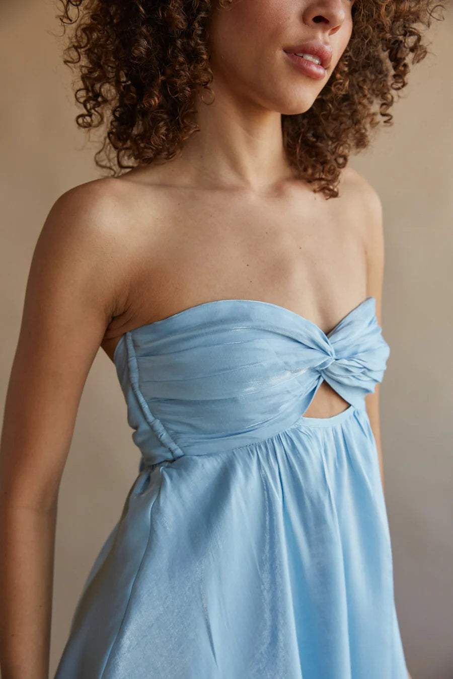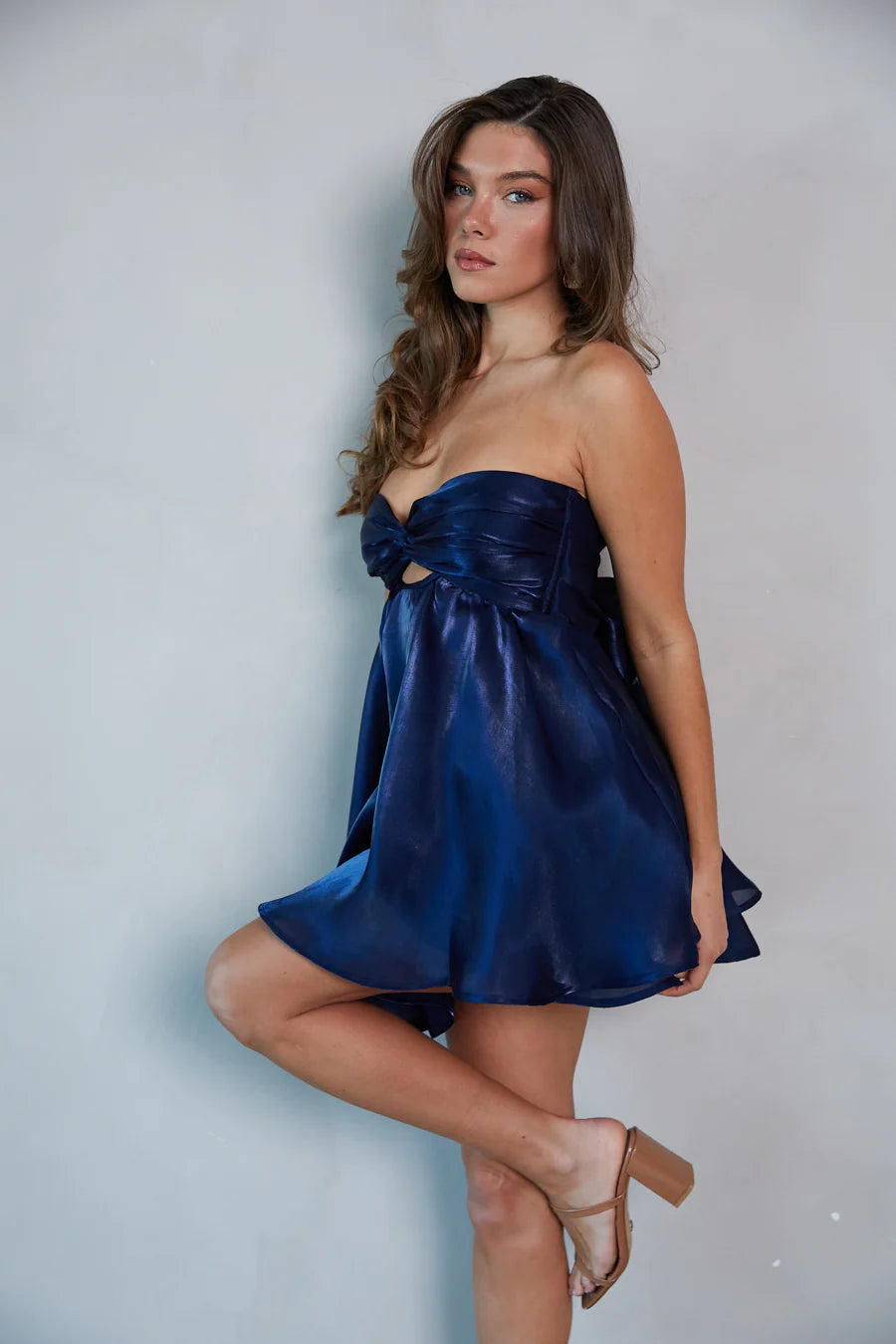 Be the life of the party in the Gabby Strapless Twist Front Babydoll Dress! This sweet and sassy mini dress is made of eye-catching shimmering fabric and features a babydoll silhouette, strapless twist front bust with a keyhole detail, adjustable bow back, and a two-tiered skirt. Available in chambray, berry, and white. Pair with ayou can dance the night away in!