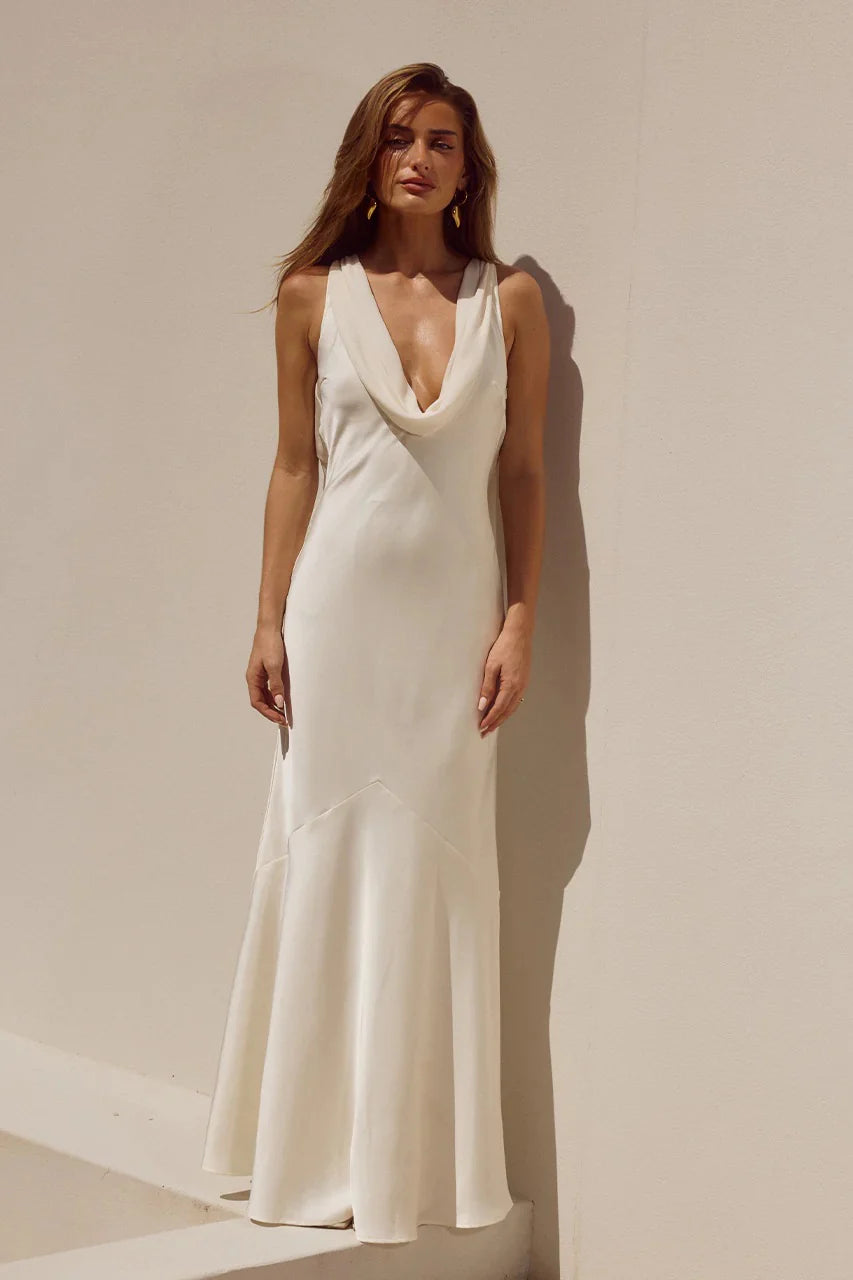 With a cowl neck that extends behind the back into flowing sashes, our Gabriella Maxi Dress is an ethereal feminine look.