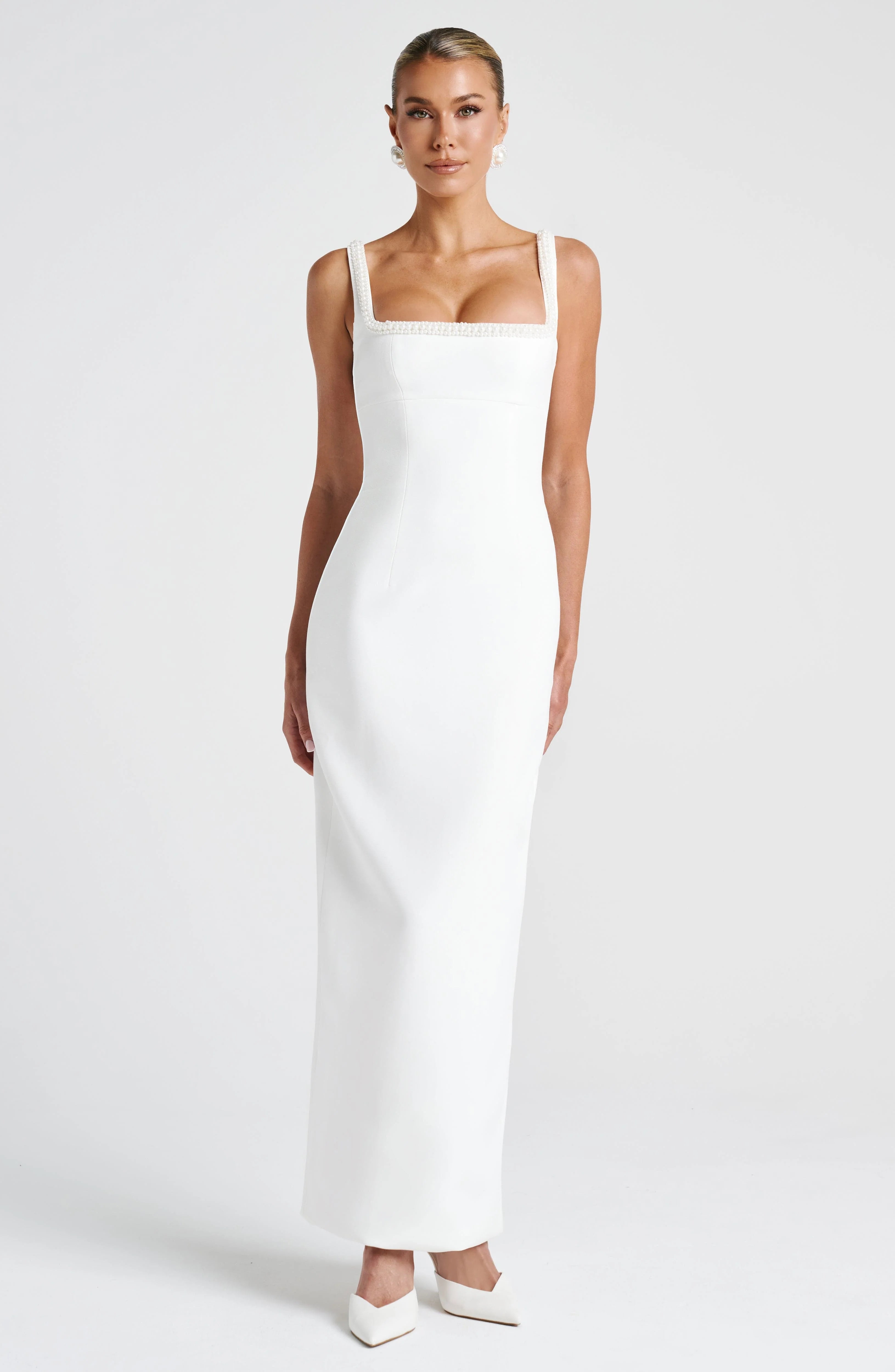 Elegant and refined, the Ines Midaxi Dress in Ivory is crafted from structured non-stretch crepe for a sleek, tailored fit. A square neckline adorned with a delicate pearl trim adds a touch of luxury. The pencil-shaped skirt creates a flattering silhouette, making it an ideal choice for bridal showers, engagement celebrations, or special occasions. Pair it with classic heels and minimal jewellery for a timeless, polished look.