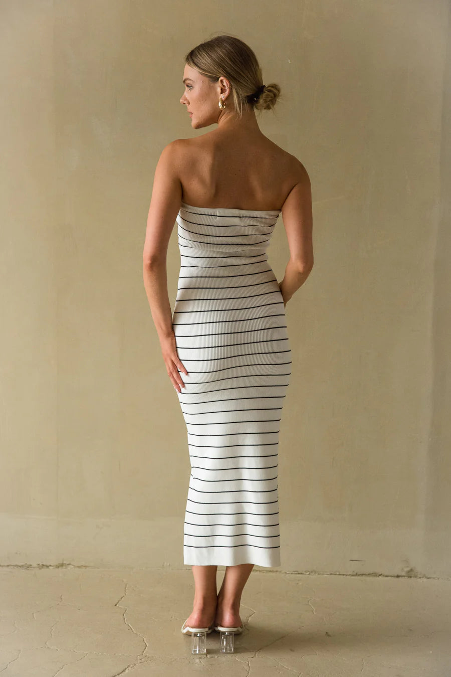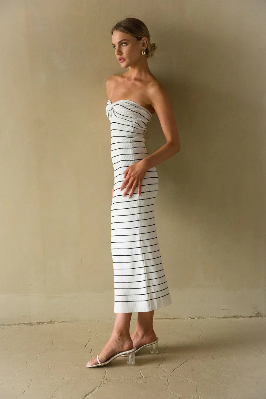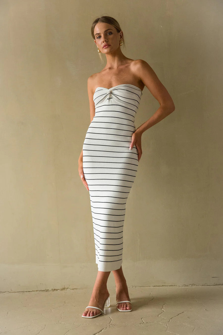 Let's go boating in the Jaclyn Strapless Twist Front Knit Midi Dress! This knit dress features a strapless sweetheart neckline, twist front detail, and classy striped pattern! Accessorize to complete the look!