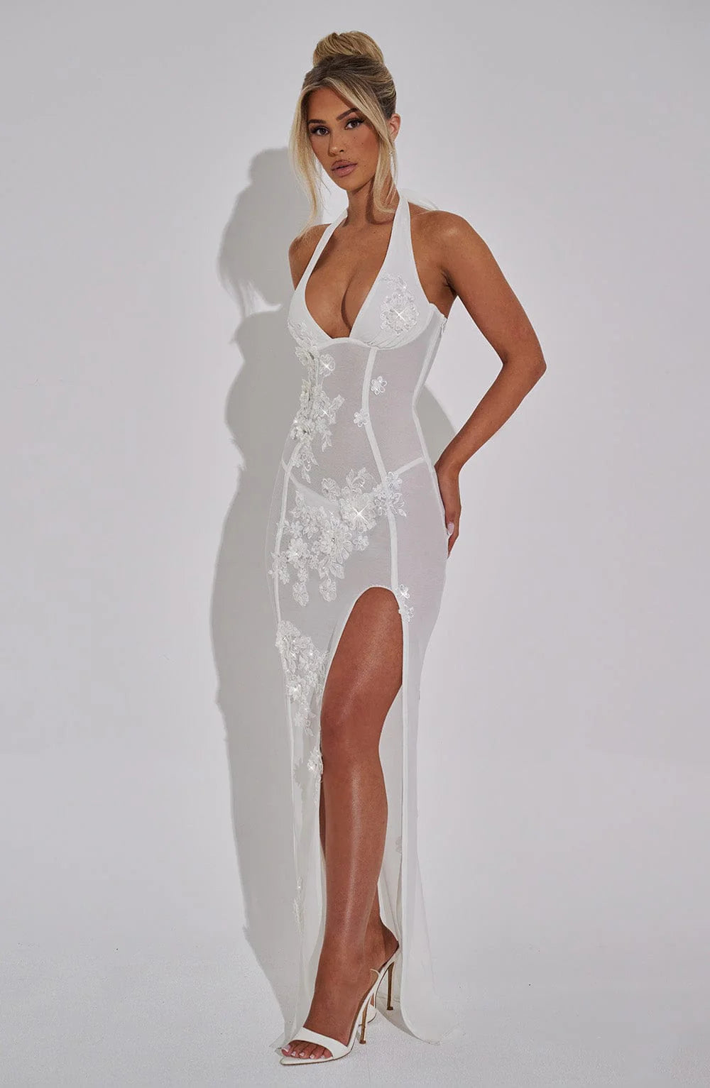 Introducing the exquisite and exclusive Jacqueline Maxi Dress. Made from premium stretch mesh, this ivory dress boasts a sheer appearance, with mono-wired, lined cups and a plunging neckline. Adorned with 3D sequin floral appliques, it features a thigh-high split and a fit and flare silhouette that molds to your body's contours. Finished with an invisible zip fastening, it exudes elegance and class in a maxi length.