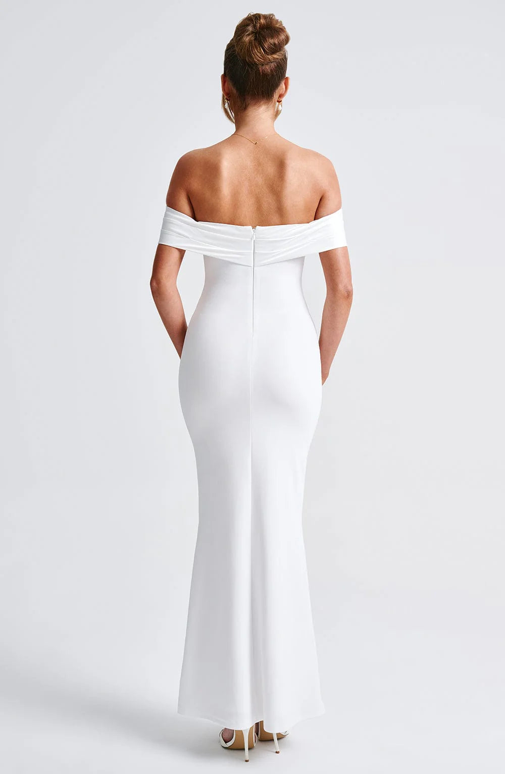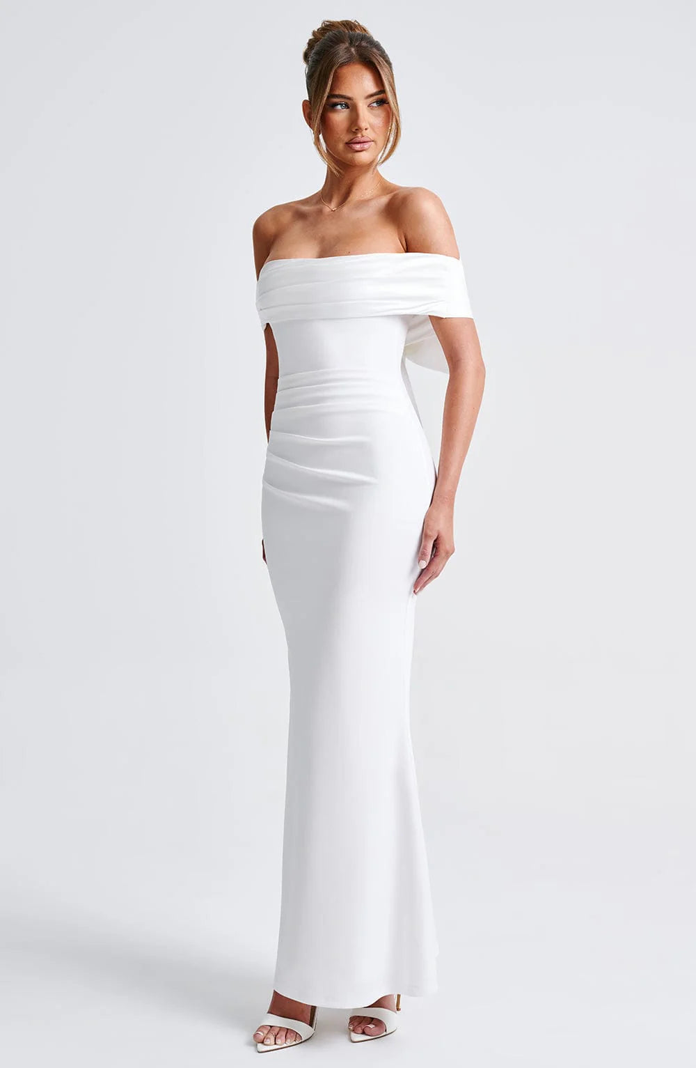 Introducing the dreamiest dress to say 'I do' in. Joanna is cut from our luxe stretch crepe that hugs the figure and flares gently at the skirt. It has a pleated satin bardot panel neckline with stunning removable bow to the reverse. It's complete with pleats to the waist.