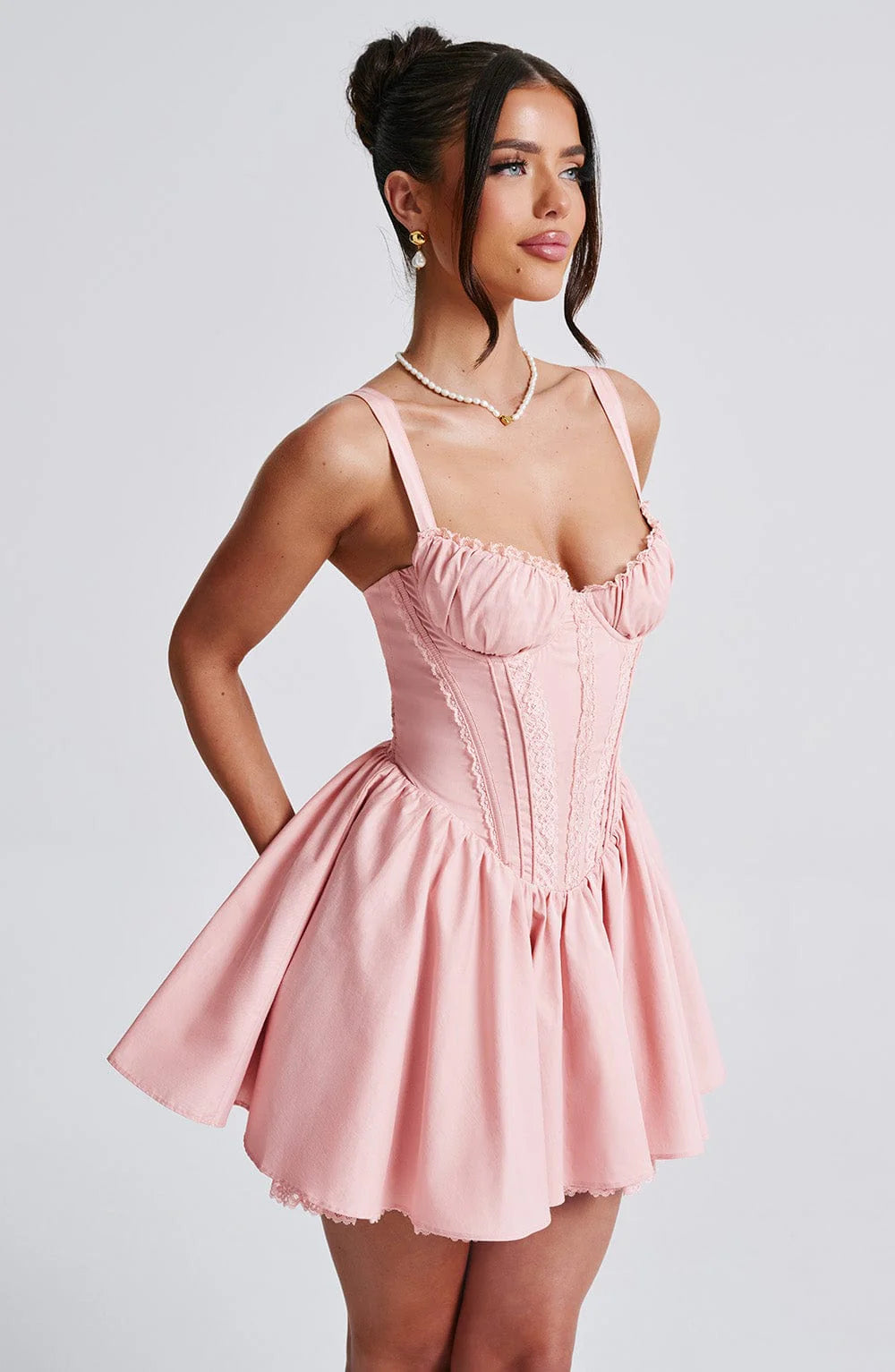 The perfect dress for date nights with the prettiest silhouette, Josie is cut from our premium cotton blend with flirty lace trims to the bust and skirt. With an oversized bow to the back, this flirty design has a boned bodice for the ultimate snatched waist, which is a pretty contrast to the super full skirt. Style this mini with romantic waved hair and barely there mule heels.