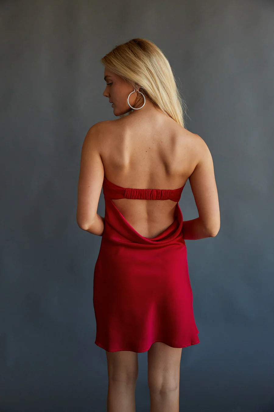 Get ready to WOW in the Josie Strapless Open Back Mini Dress! This chic dress features a strapless straight across neckline with a fold over trim and an open cowl back with a smocked strap. Available in cobalt blue, cherry red, periwinkle blue, white, rose, black & white contrast, wine, and black. Pair with a cute heel to complete the look!