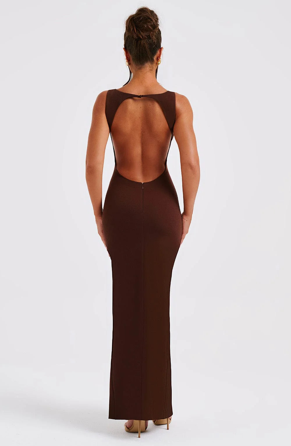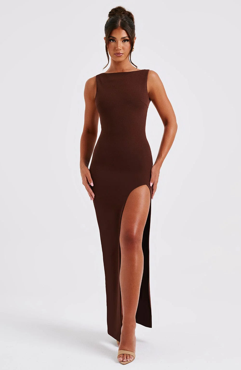 Kassandra is our timeless, chic maxi, cut with a boat neck that fastens to the back neck with a button. This maxi is made from our luxury stretch crepe with a thigh high shaped split and low scoop back.