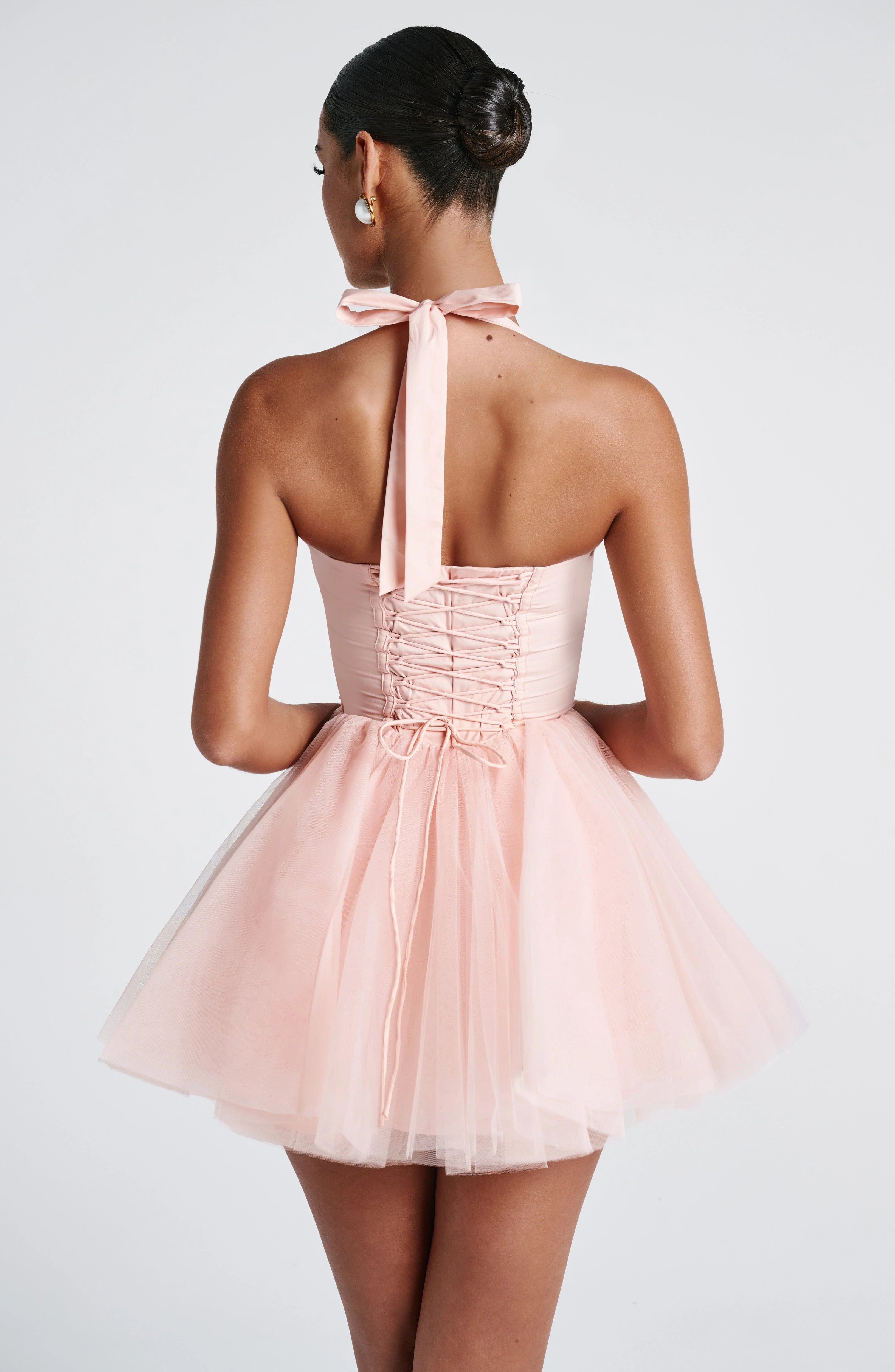 Turn heads in the Keely Mini Dress in Soft Peach - a dreamy blend of elegance and allure. Designed with an underwired, sweetheart neckline and pleated cups, it offers the perfect lift and shape. The halter neck straps tie gracefully at the back, while the lace-up back cinches your waist for a flawless fit. Finished with a full, tulle skirt, Keely delivers fairy-tale vibes with a flirty twist.