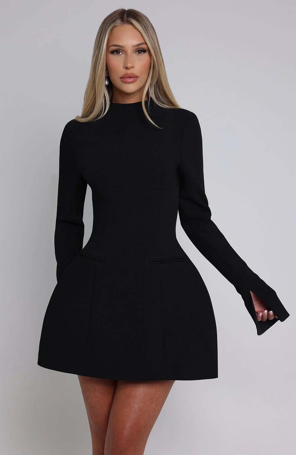Kelly is here to dress you for the new season and big dreams. This chic mini is made from premium crepe, with long sleeves and a high darted neckline. It features a keyhole cut out to the back and is complete with welt pockets and bubble shaped skirt. Style with pointed heels and a tonal mini bag.