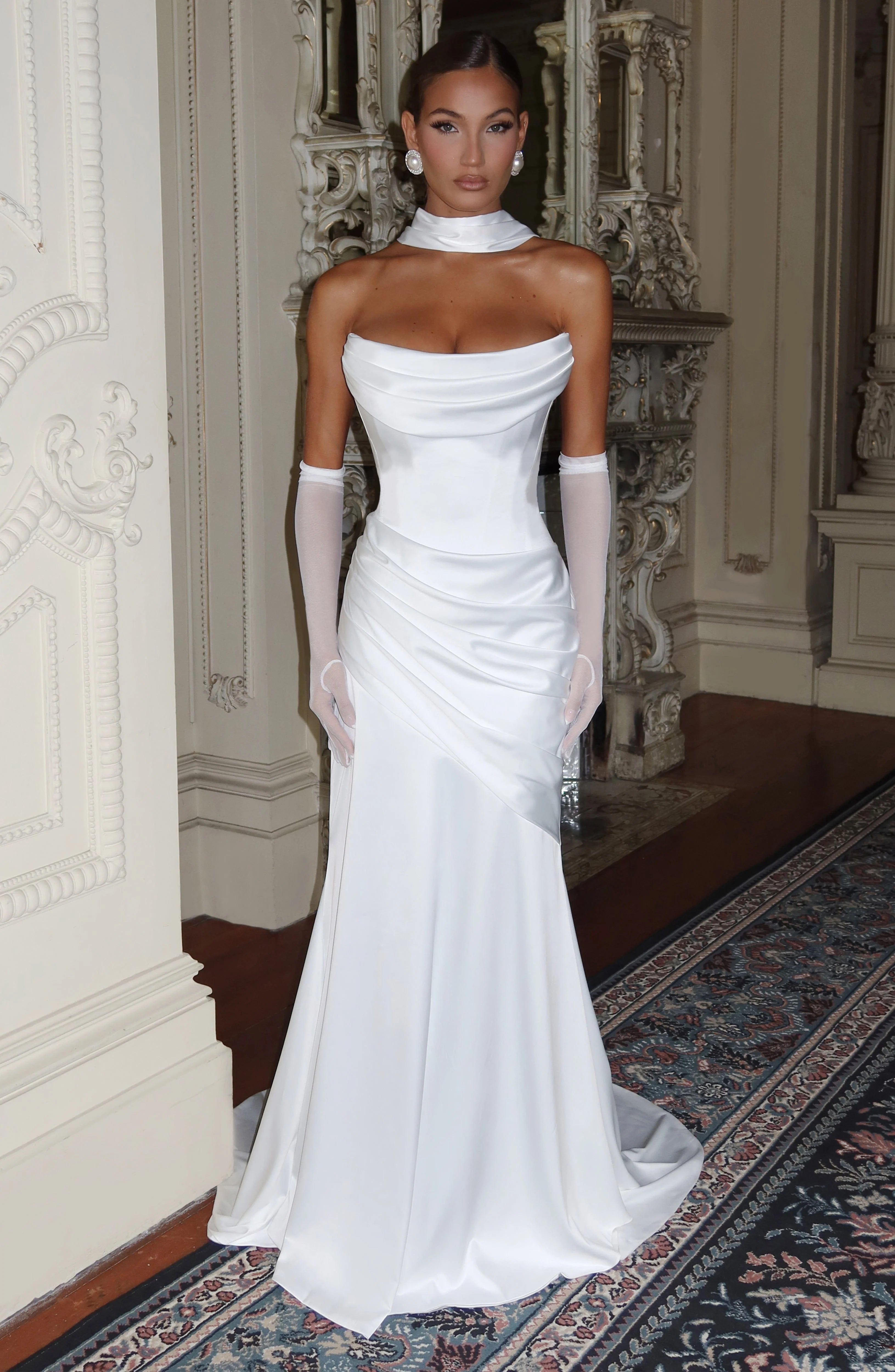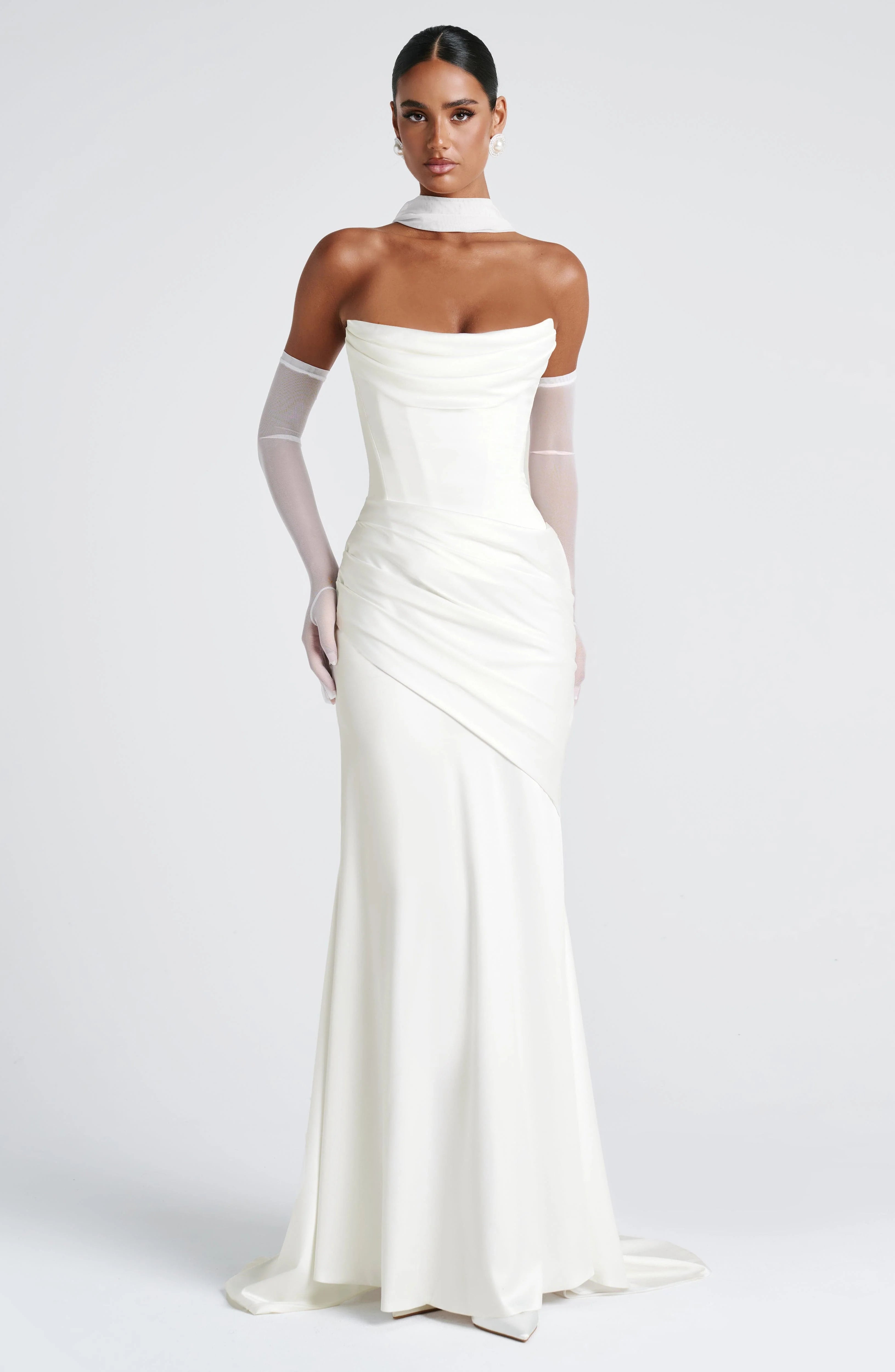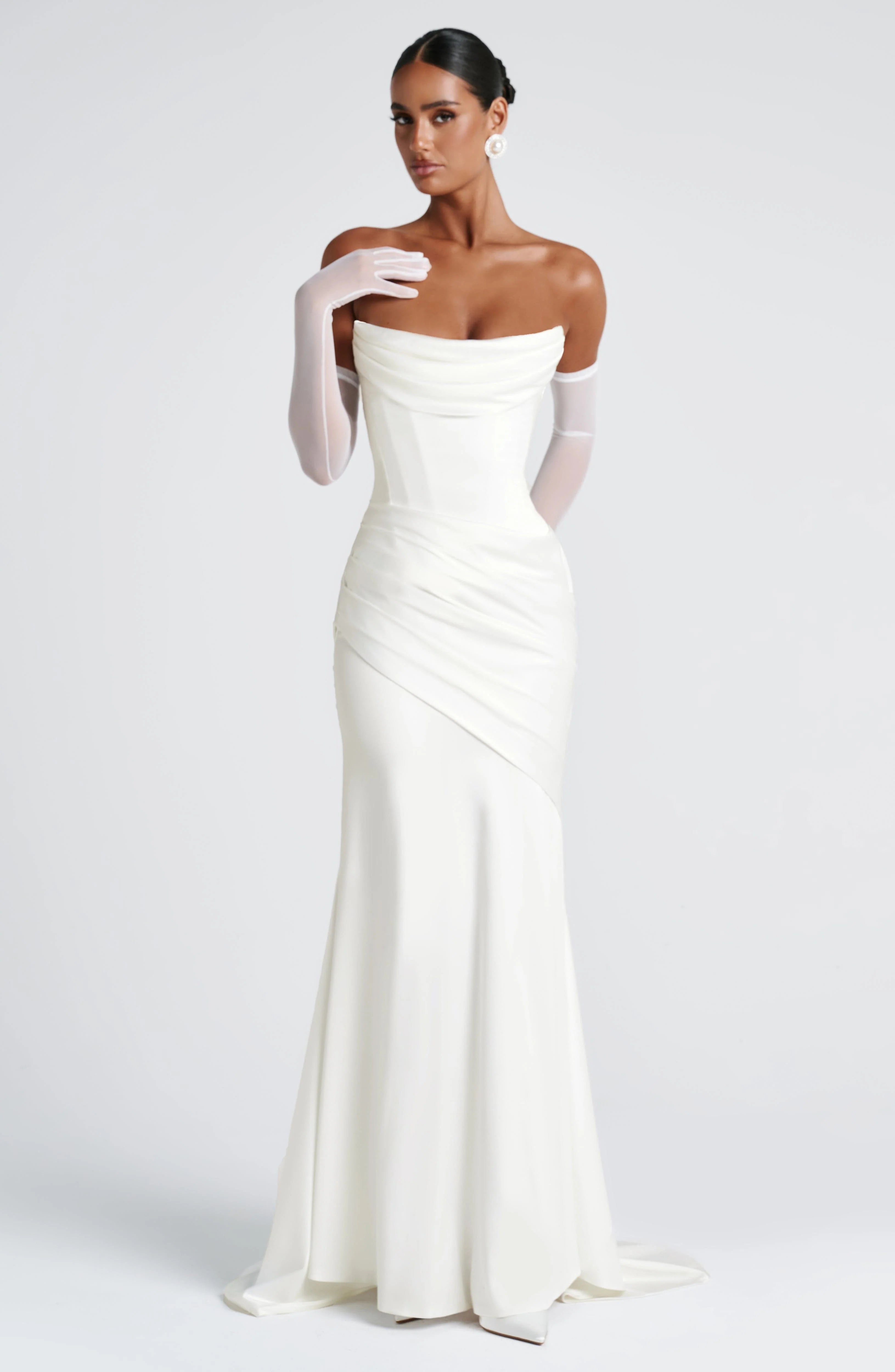 The Kensington Maxi Dress in Ivory is a showstopper. Crafted from luxurious stretch satin, this strapless gown features a structured boned bodice, a scooped cowl neckline, and a pleated draped panel that flows into a flattering mermaid shape skirt. The stunning train can be bustled for versatility, while the lace-up back ensures a perfect fit. This dress is an unforgettable choice for any special occasion.