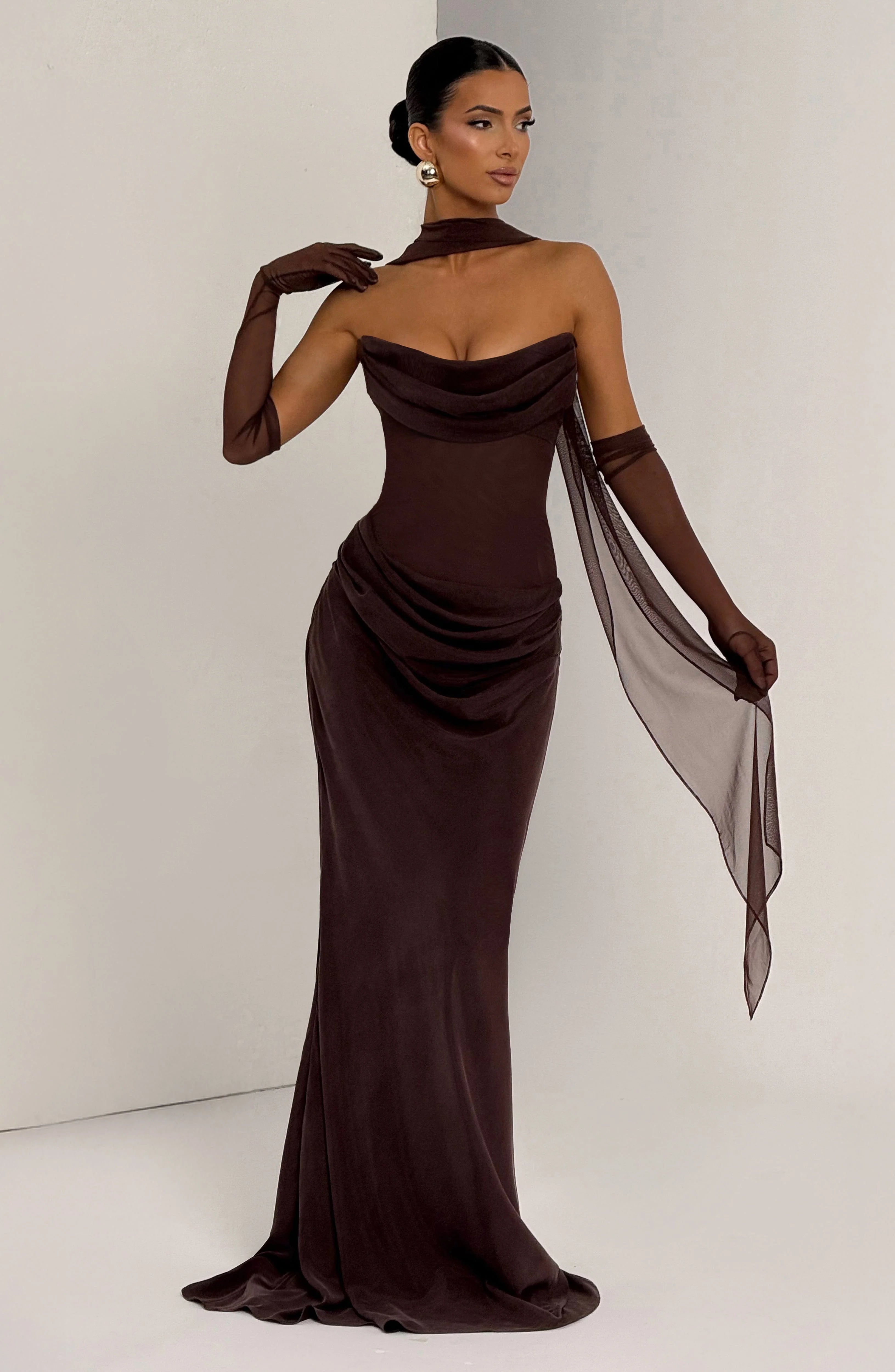 The Plum Brown Liora Maxi Dress features a strapless cowled neckline, structured bust, and lace-up back with boning for a tailored fit. Its asymmetric bias-cut skirt offers a graceful fit-and-flare silhouette, finished with a discreet side zipper.
