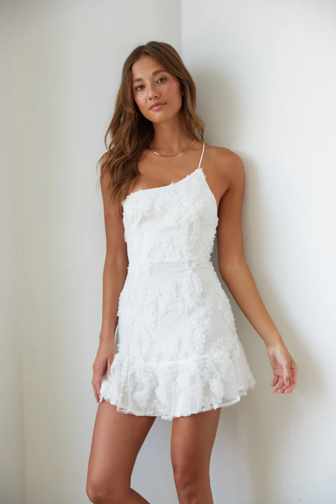 Hey babe, meet the mini dress of your dreams! The Livia One Shoulder Lace Ruffle Mini Dress is the perfect white party dress. Featuring an asymmetrical neckline with an adjustable spaghetti strap, ruffle hem, and subtle polka dots. Available in white and blue.