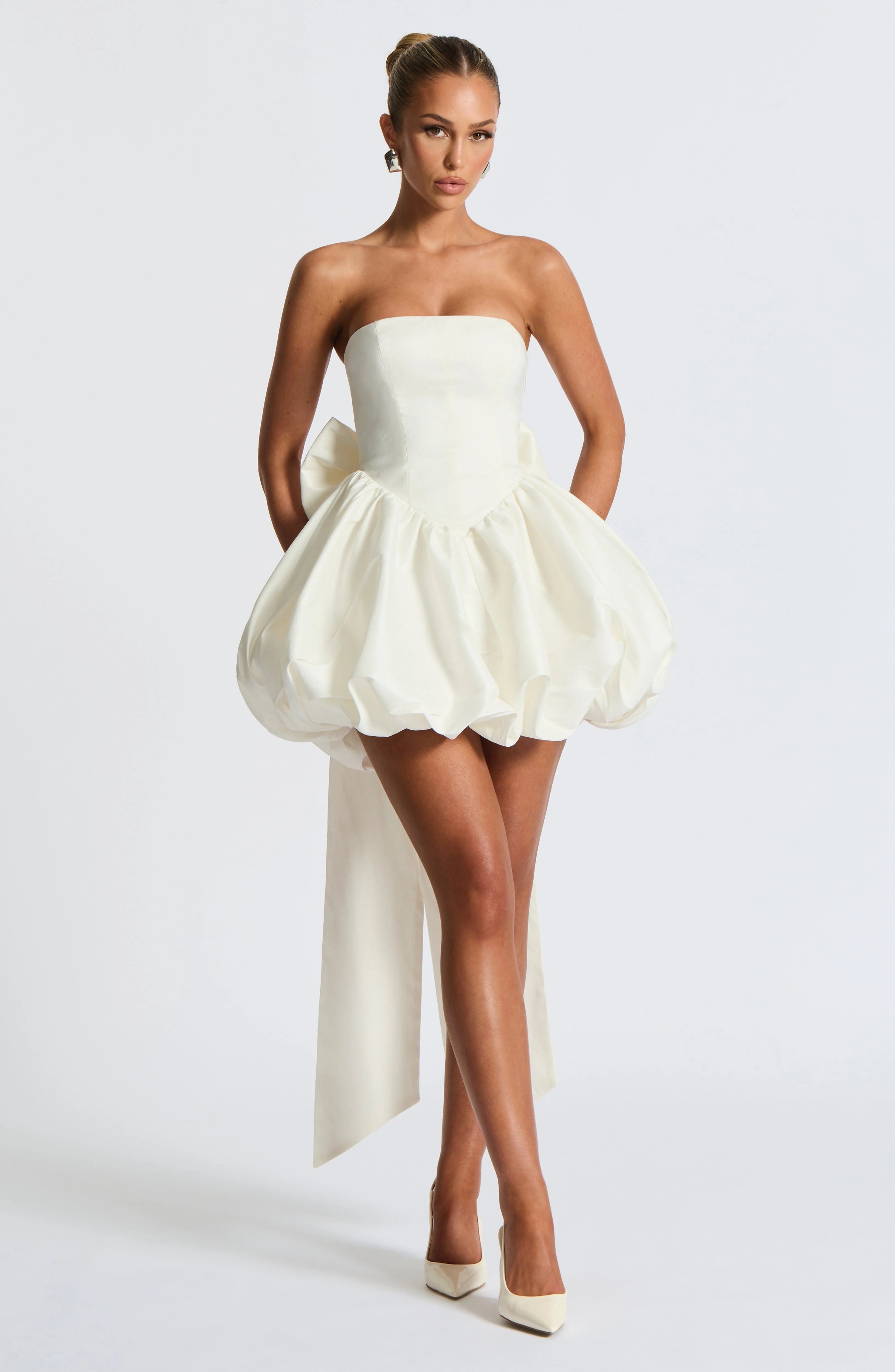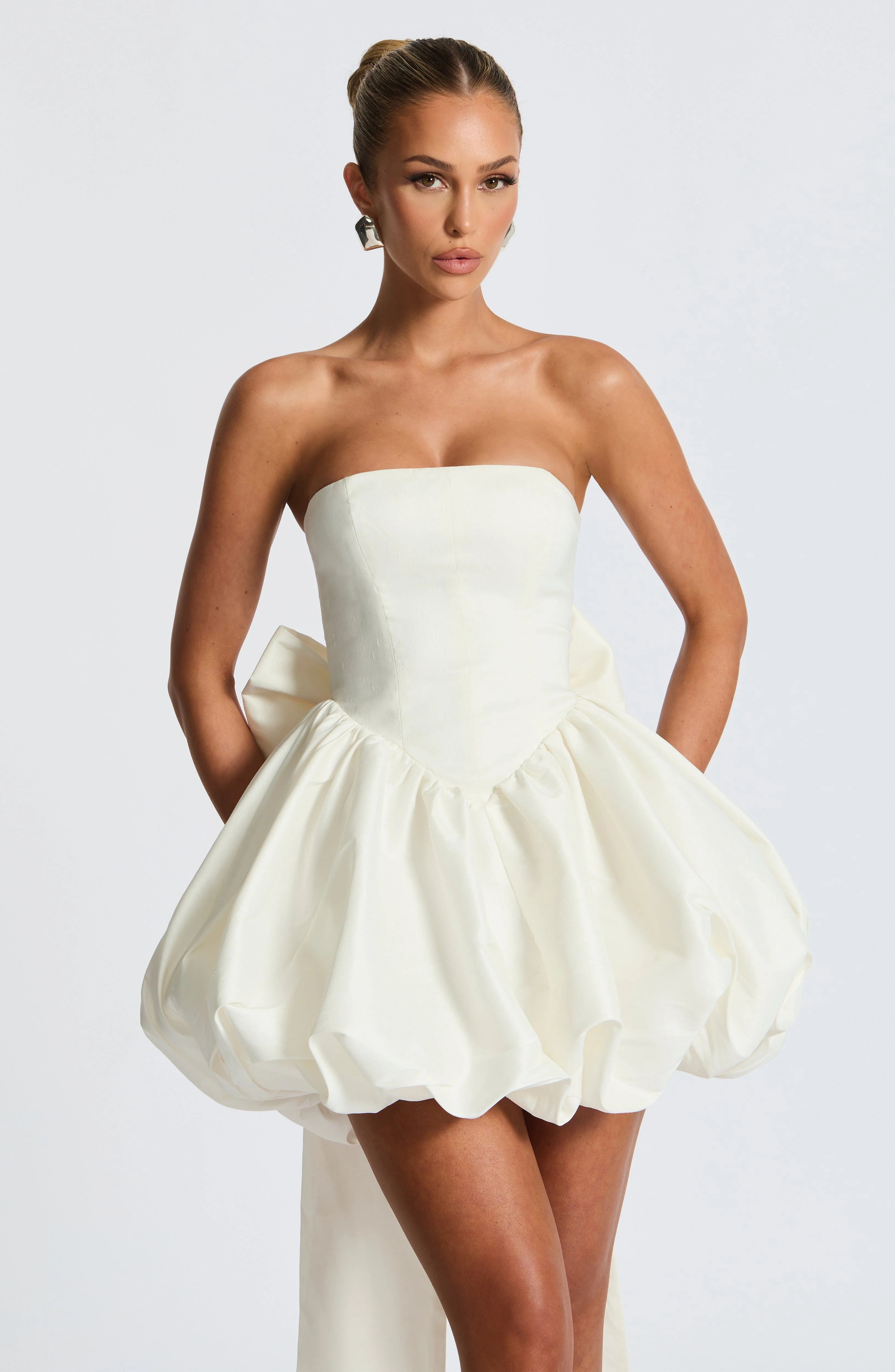 Indulge in luxury with our Lotus Mini Dress. The textured taffeta fabric accentuates the mini length and strapless neckline, while the bodice's boning provides a flawless fit. The full puff ball shape skirt is gathered at the waist for a flattering silhouette. Complete with a lace-up back and detachable bow, this dress exudes sophistication and elegance.