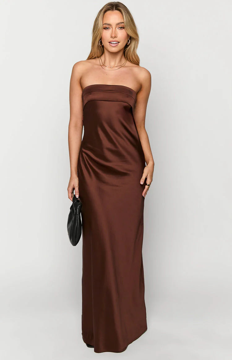 Our Brown Maxi Dress embodies timeless elegance. The rich brown satin fabric adds a touch of luxury to this elegant maxi dress. Elevate the look with dainty gold jewellery and black strappy heels for a stunning evening outfit.