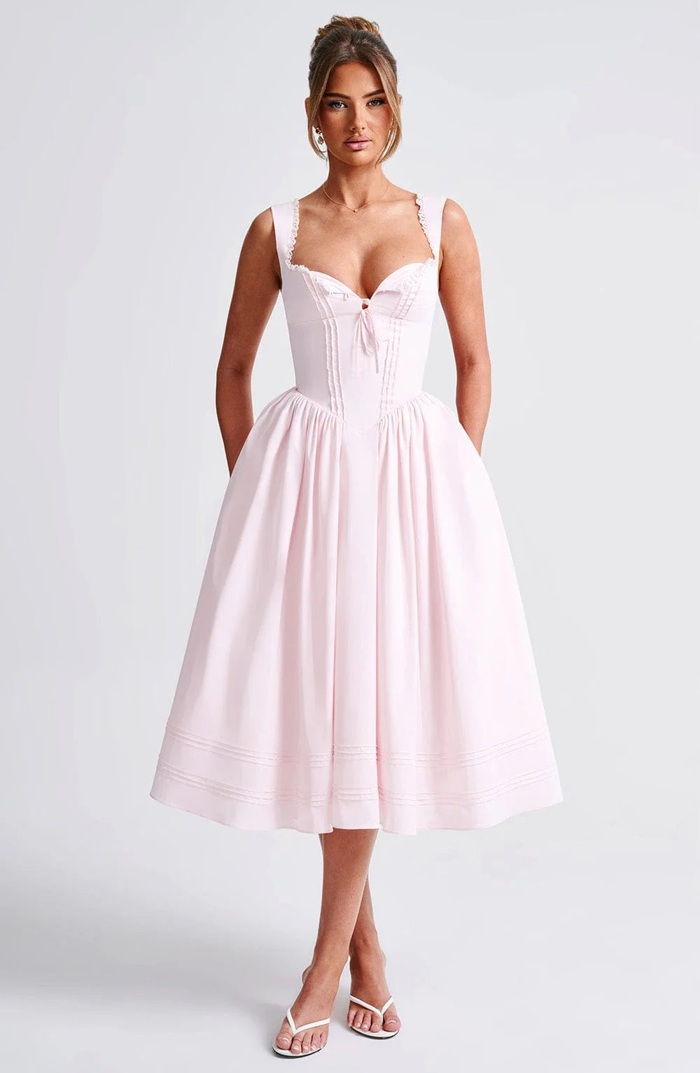 Put a pretty twist on your next bridal look with Marlena, our dreamy blush midi made with a super snatched waist and full, voluminous skirt. Crafted in our premium cotton-blend fabric with all-over floral print, this square neck design is complete with pintuck, lace trim and button details and a lace up back for your perfect fit. Paired with soft waves, glowing makeup and statement earrings, make all the memories in Marlena.