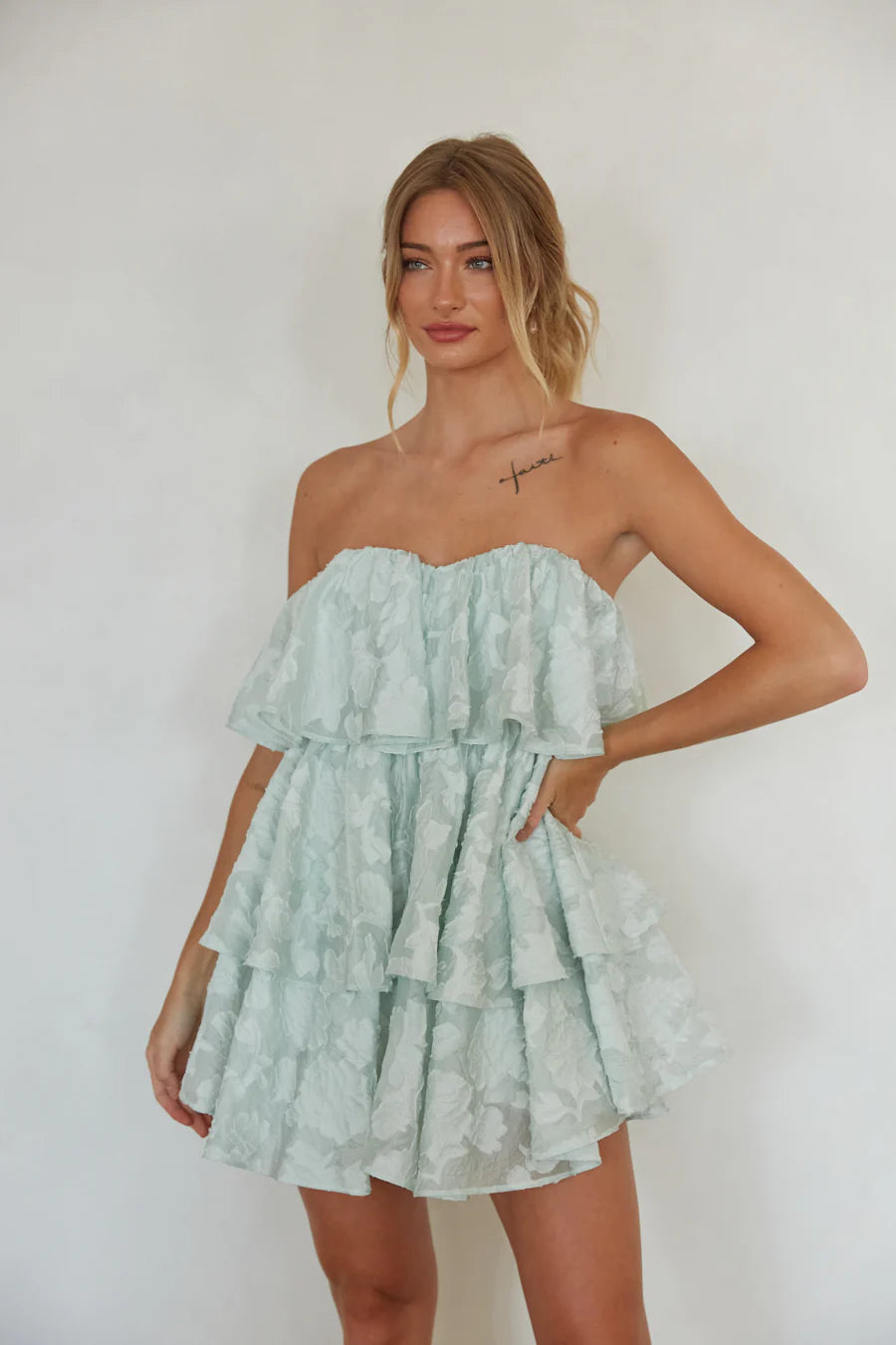Make a romantic statement in the Masie Floral Sequin Strapless Babydoll Mini Dress! This stunning dress features a floral sequin embellished overlay, strapless sweetheart neckline, and a tiered ruffle skirt. Slip into an elegant to complete this unforgettable look!