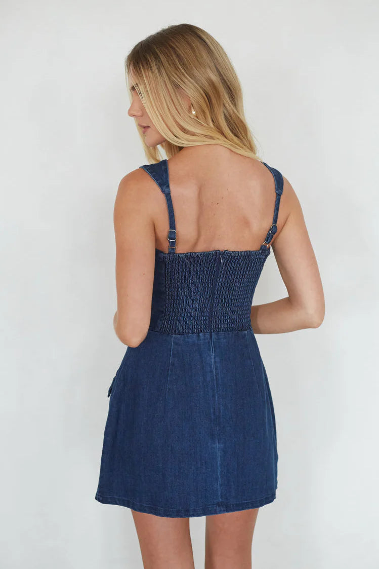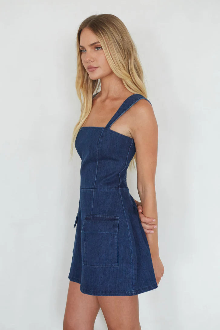 Our best-selling style, the Margaret Romper Mini Dress, now with a fresh new take in DENIM.