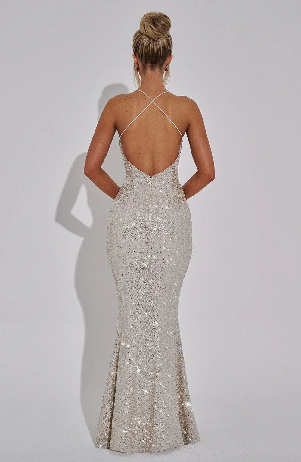 Shine like champagne in our Meridith Maxi Dress. The luxury textured sequin fabric hugs your body while the fit and flare skirt adds movement. The elasticated spaghetti straps and scoop neckline offer comfort, and the detachable bow adds an unexpected touch. Perfect for any special occasion.