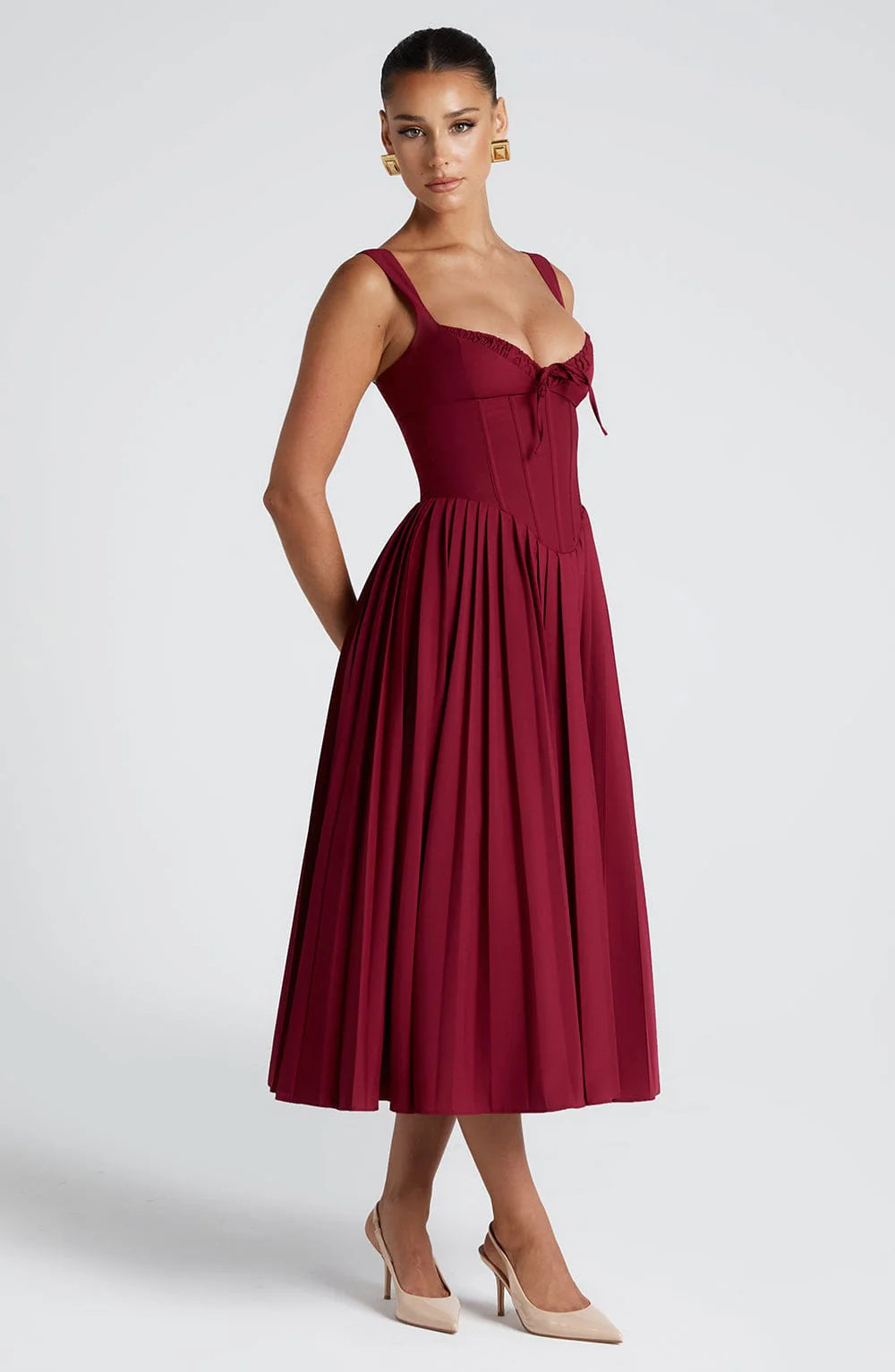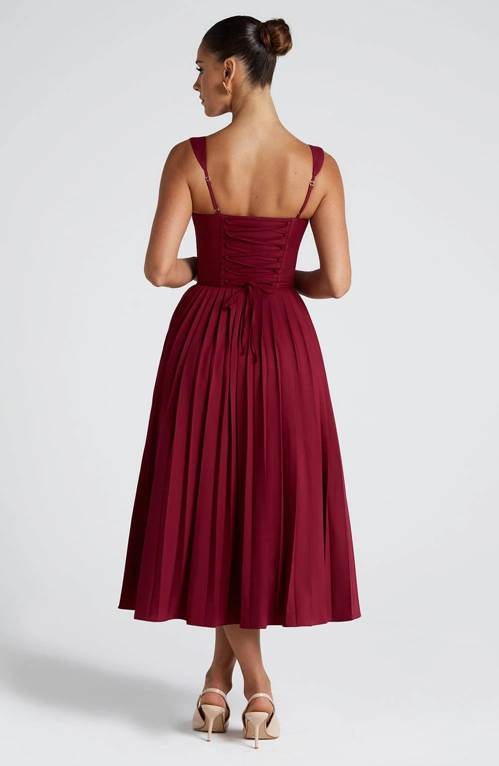 The Natassia Midi Dress in Berry is a romantic statement piece that's designed to flatter with its beautiful structure and feminine details. Featuring boning in the bodice for a sculpted silhouette, a lace-up back for a perfectly snatched fit, and a flowing knife-pleated skirt, this dress moves beautifully with every step.