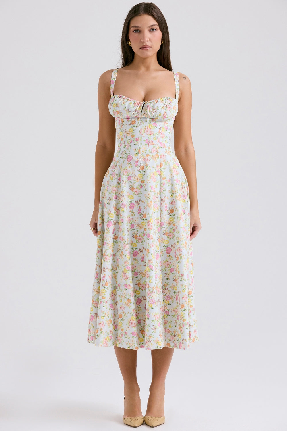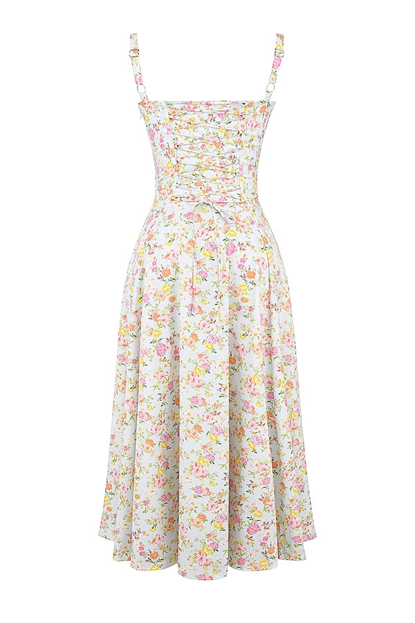 You'll feel ultra feminine in our 'Carmen' dress that's the perfect fit for Spring and Summer garden parties. It's cut from stretch cotton in a gorgeous pale blue Meadow print and has a corseted bodice with a beautiful lace up back. The gathered bust has a drawstring tie and the side split adds a little sexiness to reveal a flash of leg.