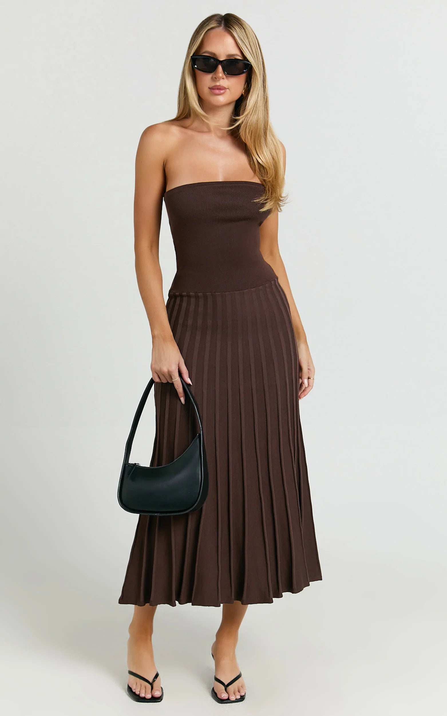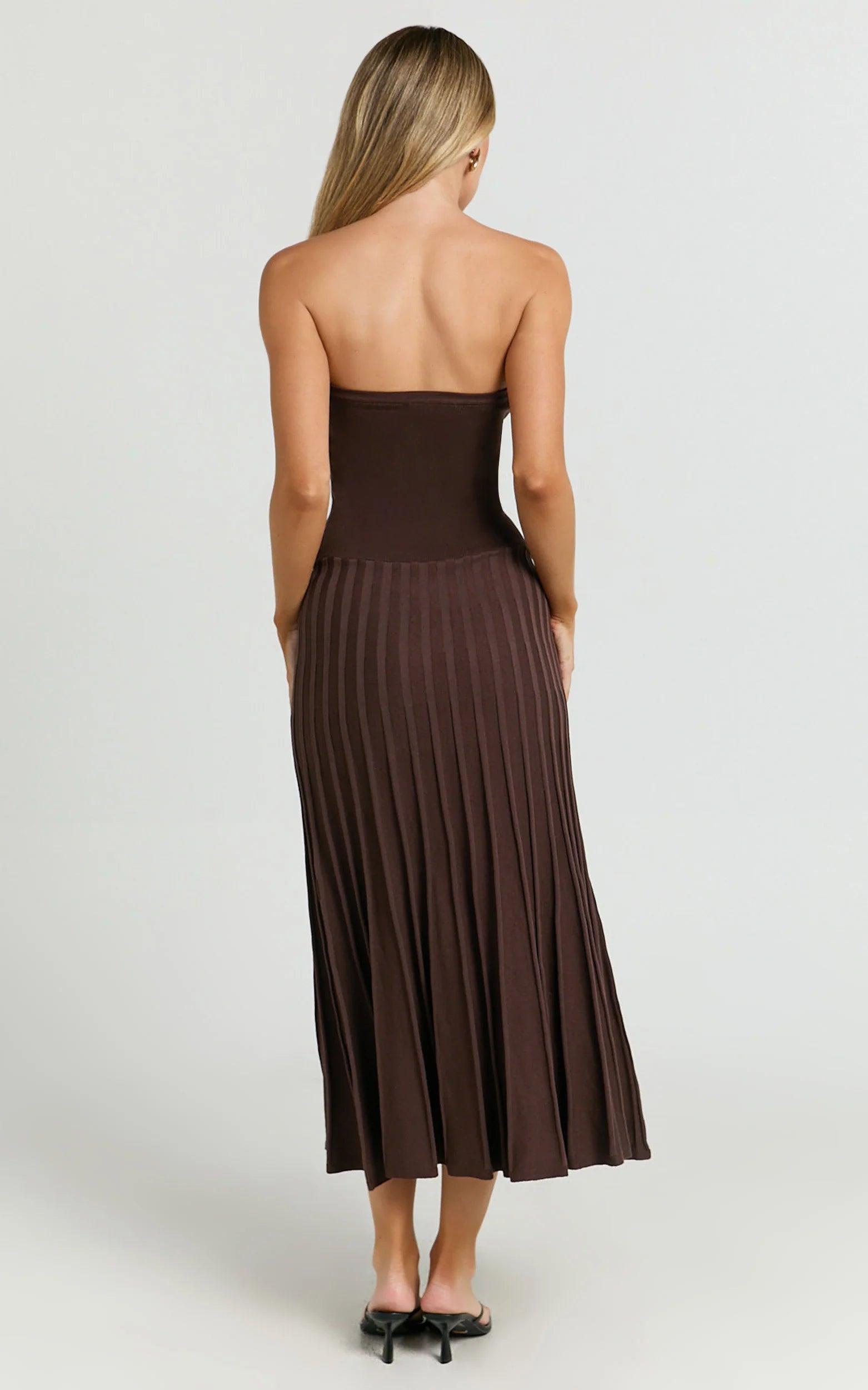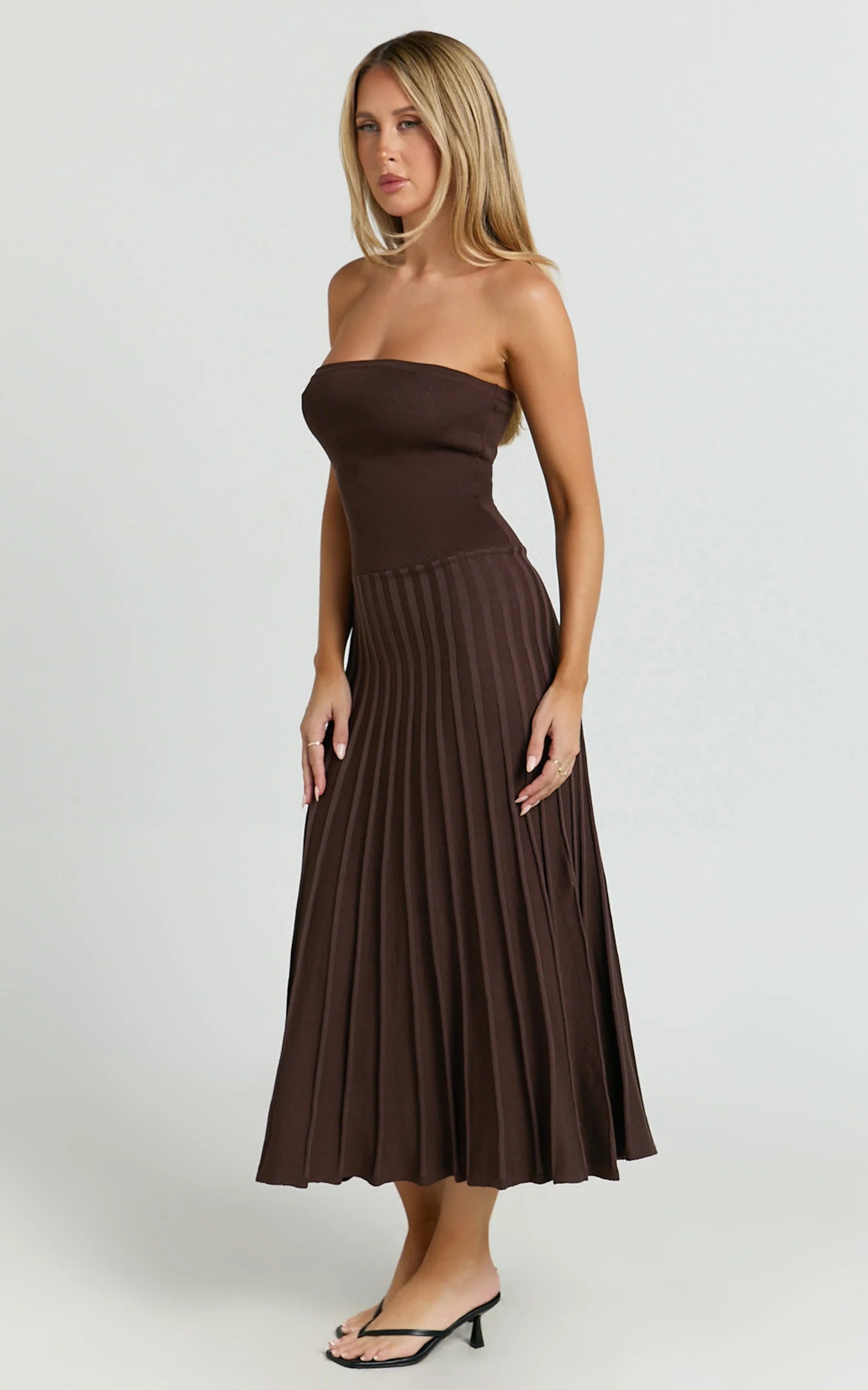 This strapless, chocolate-brown number effortlessly combines vintage-inspired elegance with playful Y2K flair. Featuring a flattering drop waist and pleated knit detailing, this midi dress is designed to accentuate your curves beautifully.