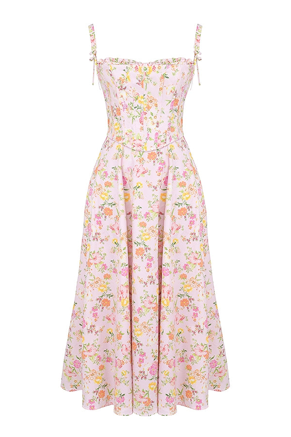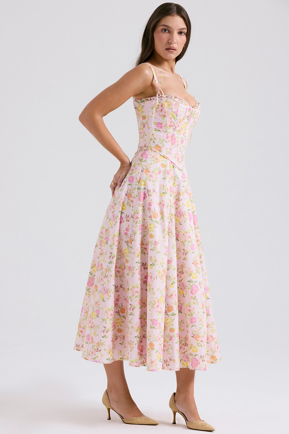 The beautiful floral print is part of what makes our 'Clarabelle' dress feel so romantic. It's cut from stretch cotton-rich fabric in a pink meadow print for a warm Spring and Summer like feel. 'Clarabelle' has a pretty trim to the corseted bodice that cinches and defines your waist perfectly.