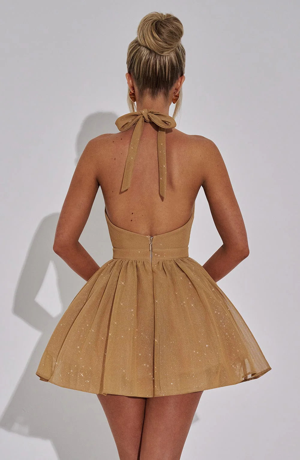 Be the life of the party in our Pippa Mini Dress - Gold Sparkle! This dress features sparkling stretch mesh fabric, a fully lined plunging halter neckline, and a low scoop back. The tulle attached to the lining adds volume to the full skirt, while the invisible zipper fastening keeps you looking flawless all night long. Get ready to shine in this mini dress!