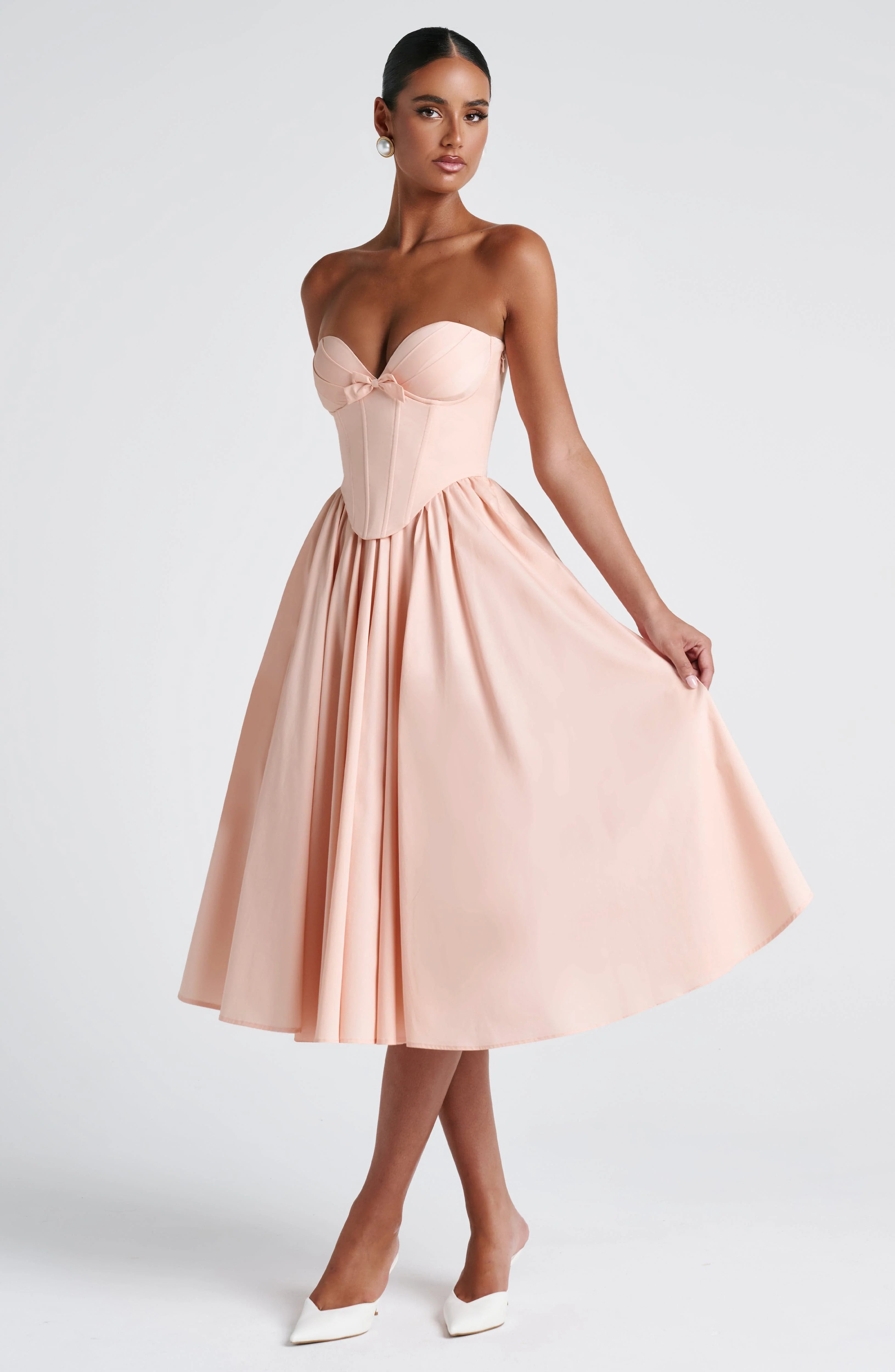 The Prim Midi Dress in Soft Peach is effortlessly romantic and elegant. Featuring a strapless, underwired sweetheart neckline with delicate pleated cups, it offers a flattering fit. A dainty bow between the cups adds a touch of charm, while the boned bodice and lace-up back sculpt the silhouette. Finished with a flowing full skirt, this dress is made for twirling the night away.