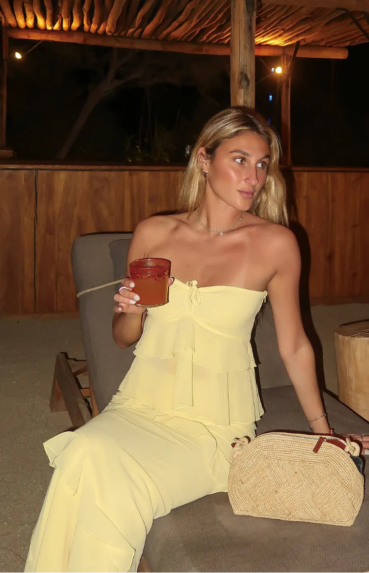 Brighten up your summer wardrobe with this vibrant yellow ruffle strapless top. Perfect for beach days and warm evenings. Style it with mini skirt or high-waisted denim shorts and sandals for a chic, casual outfit. Don't forget to accessorise with gold jewellery and straw bag for the ultimate sunny-day style.