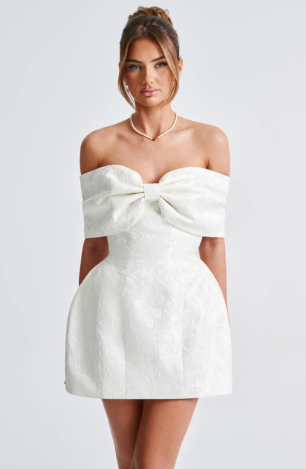 A stylish but oh-so-romantic design, Raquel is a showstopper for your big day. Cut from beautiful floral jacquard fabric, it features an off-the-shoulder bardot bow neckline to flatter the décolletage. The mini dress is complete with a tulip shaped skirt and lace up back for your perfect fit. Style with flower-adorned heels and pretty waved hair.Â